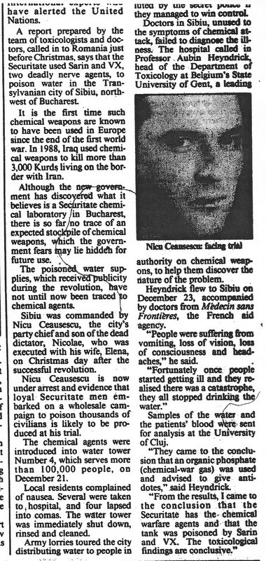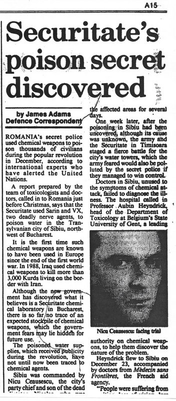 But with regards to the allegations about the water in Sibiu being poisoned, it is even easier to prove that Brates and others had a basis for disseminating this piece of news, because there was a well-placed suspicion at the time that the water had indeed been poisioned (whether or not it was, and with what substance, once again, is a different conversation). I’ll continue more on this in the next episode, but for now a recently unearthed article, dated 4 February 1990 (The Sunday Times, James Adams, Defence Correspondent, “Securitate’s poison secret discovered,” p. A15).