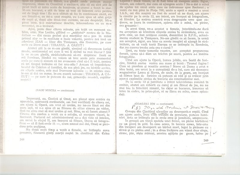Andrei Codrescu, well-known poet and National Public Radio commentator, (The Hole in the Flag. A Romanian Exile’s Story of Return and Revolution (New York, William Morrow and Company, 1991, pp. 203-204) recounts the same incident in this memorable description: