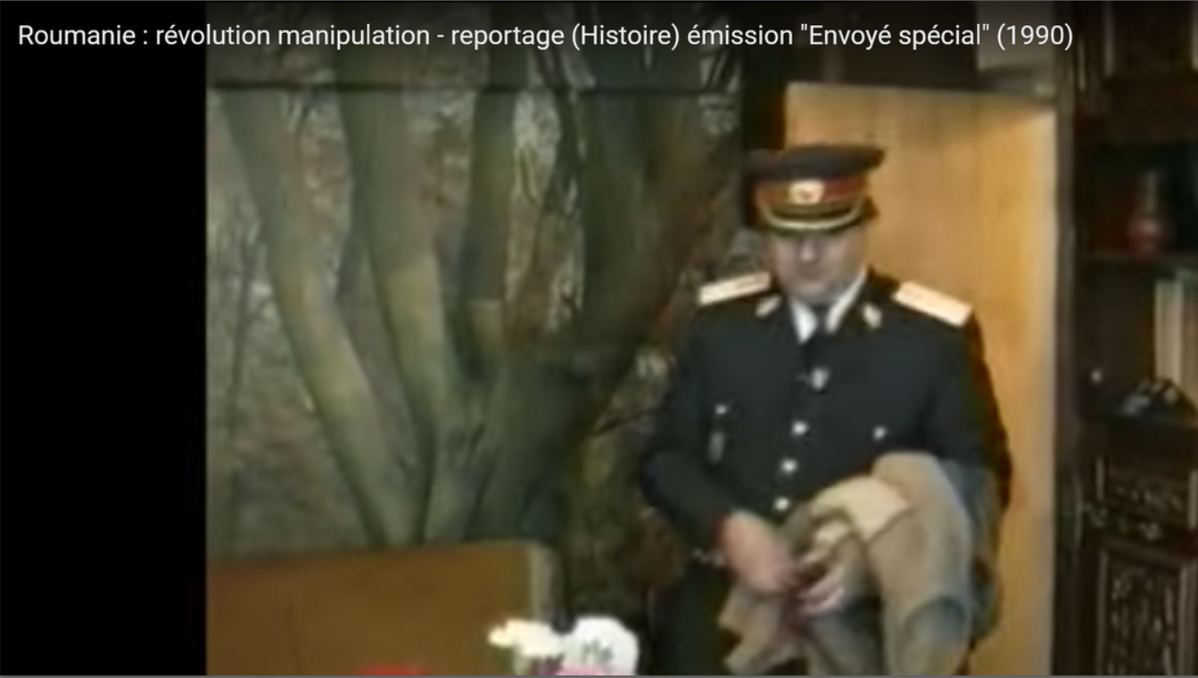 From approximately min 7:45, military prosecutor Dan Voinea is filmed in civilian clothes at the trial and execution of Nicolae and Elena Ceausescu on 25 December 1989. At approx. min 8:30, while showing the civilian clothes he wore to the French journalists and cameraman, he admits that “I dressed in civilian clothes because during this revolution they were shooting at soldiers, so I preferred to dress in civilian clothes.”