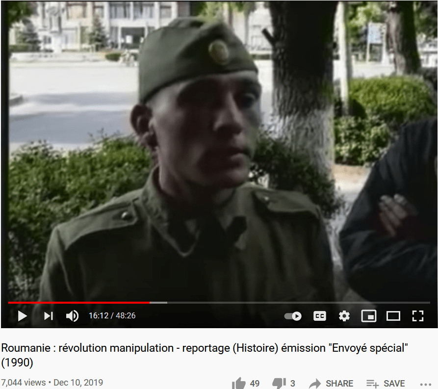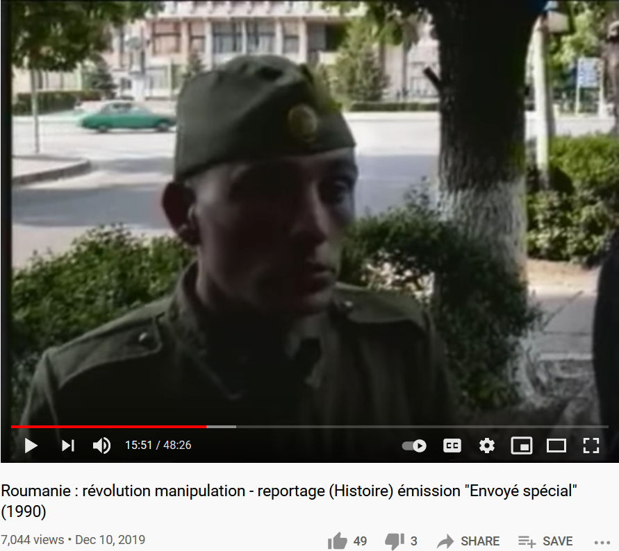 from 15:25 the French reporters and camera crew show up in Tirgoviste (Targoviste), where they recount that Ceausescu was tried amid terrorist attacks outside…it is April-May 1990, four months after the Revolution…and surprise, surprise Army officers and recruits are afraid to talk…whether at the base or even on the street…finally they find an unnamed recruit who in hushed tones agrees to talk…what does he say?