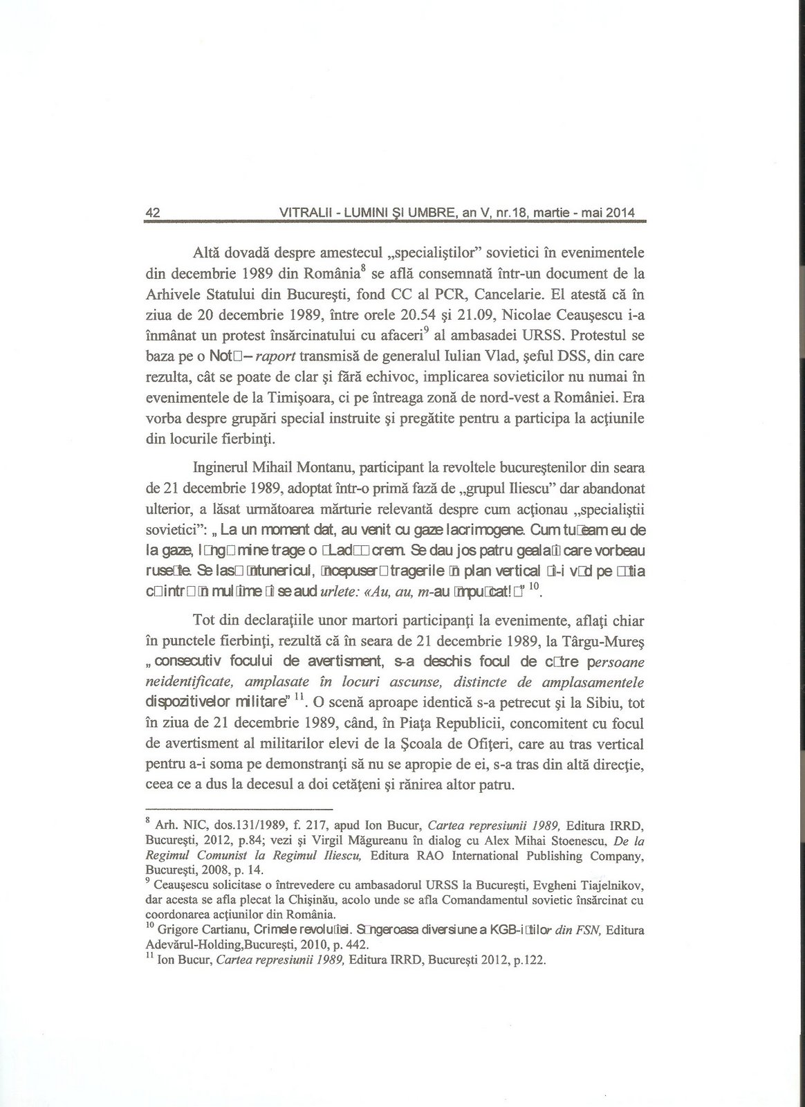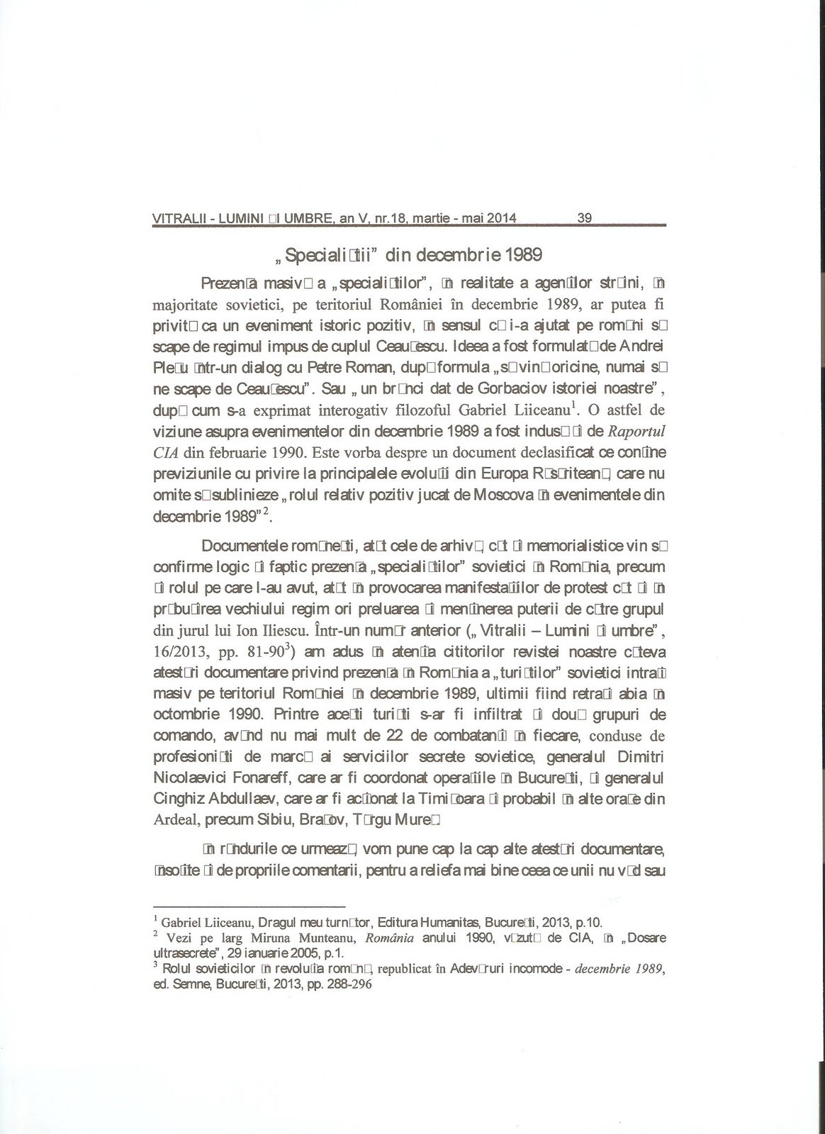 It shouldn’t be necessary to have to revisit this issue repeatedly but, in part because Romanians and Romanianists have either avoided confronting the details of the topic or have done so ineffectively, it remains necessary. The latest in the current wave–tsunami–of former Securitate disinformation is Cristian Troncota’s article „Specialiştii” din decembrie 1989 in VITRALII-LUMINI ŞI UMBRE, an V, nr. 18, martie-mai 2014, pp. 39-47 http://www.acmrr-sri.ro/upload/Vitraliino18.pdf.