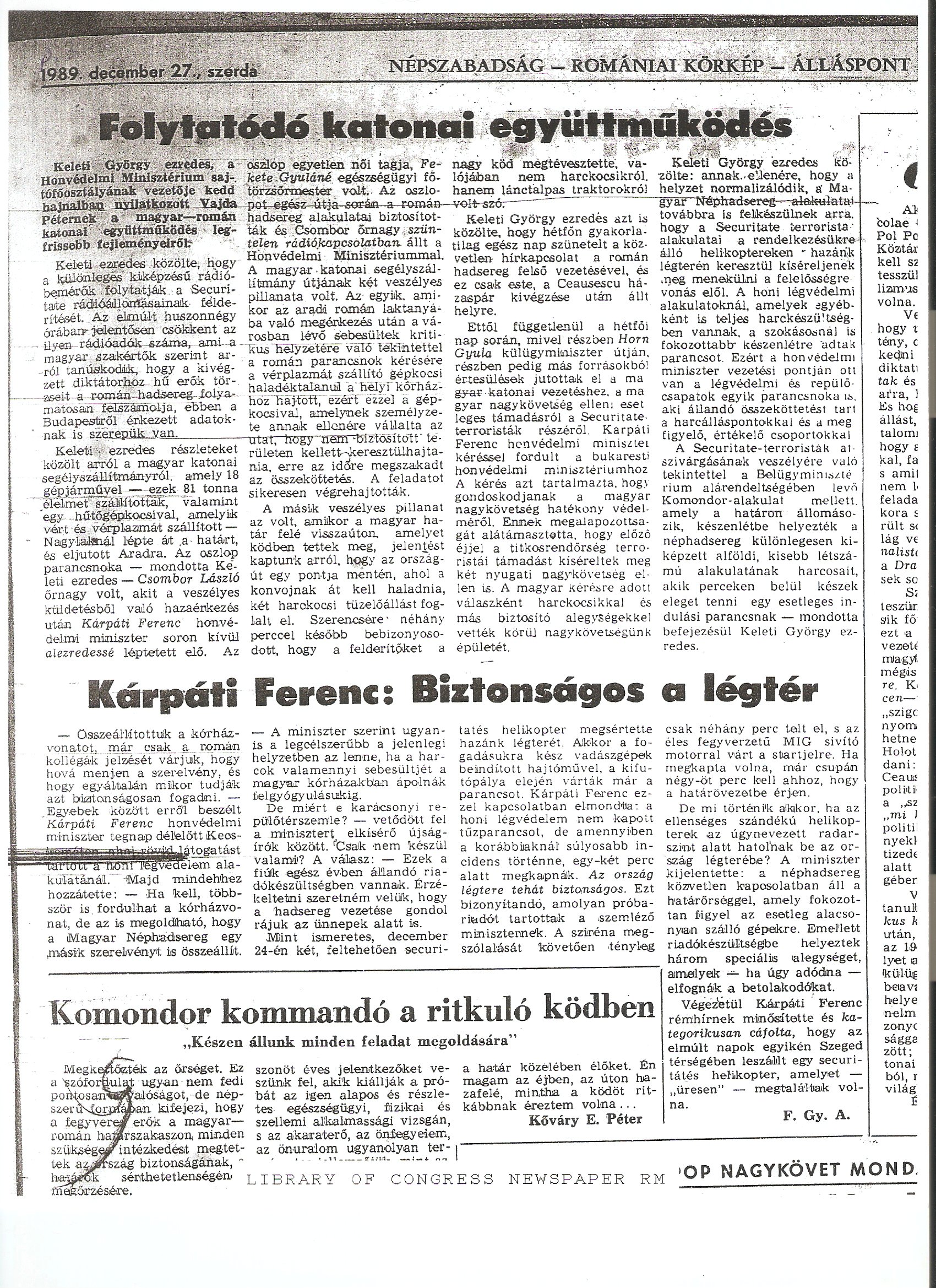 and Ferenc Karpati, Hungarian Defense Minister at the time of the Romanian Revolution of December 1989, maintained this claim in an article published in Historia in 2000: