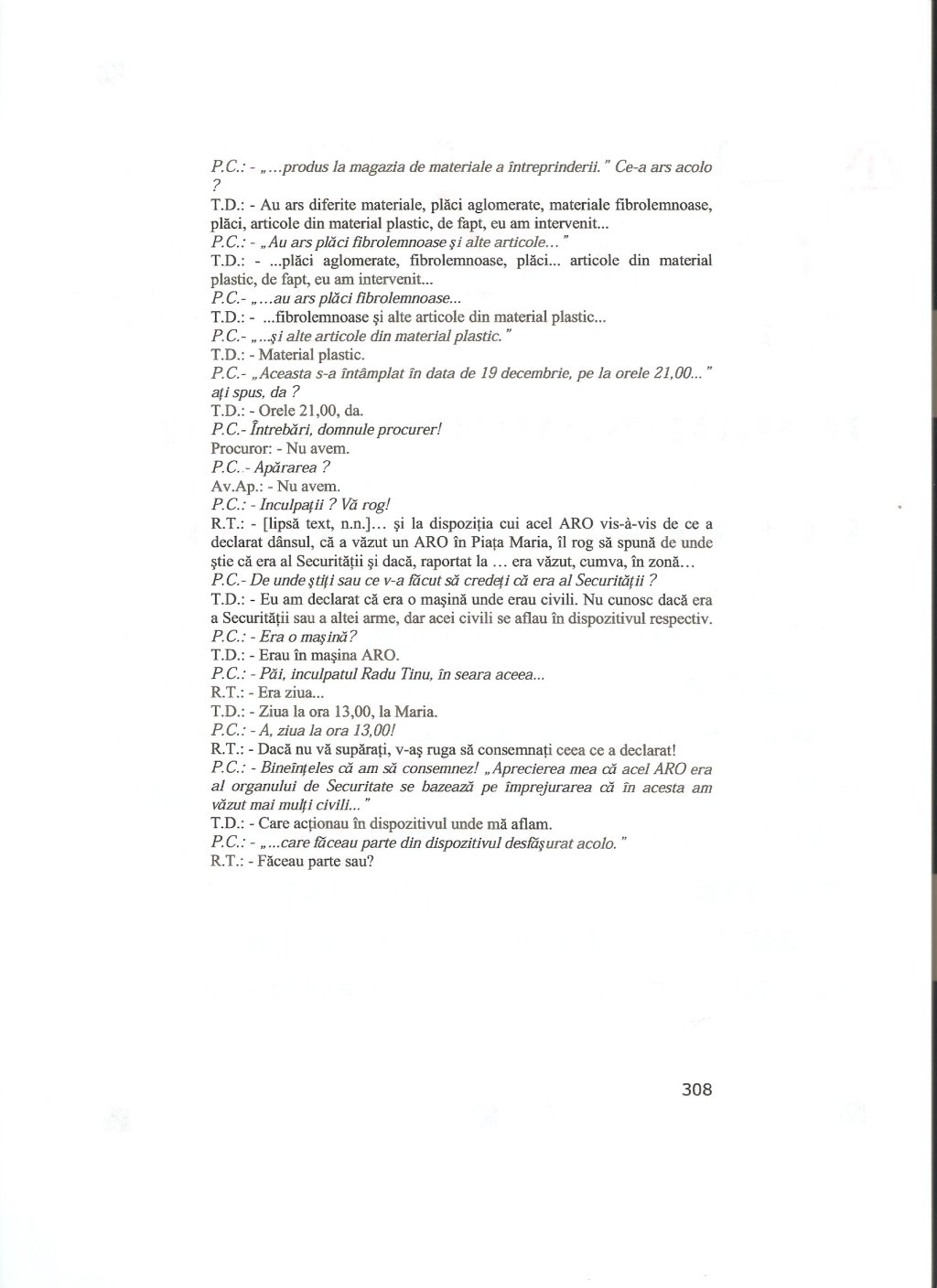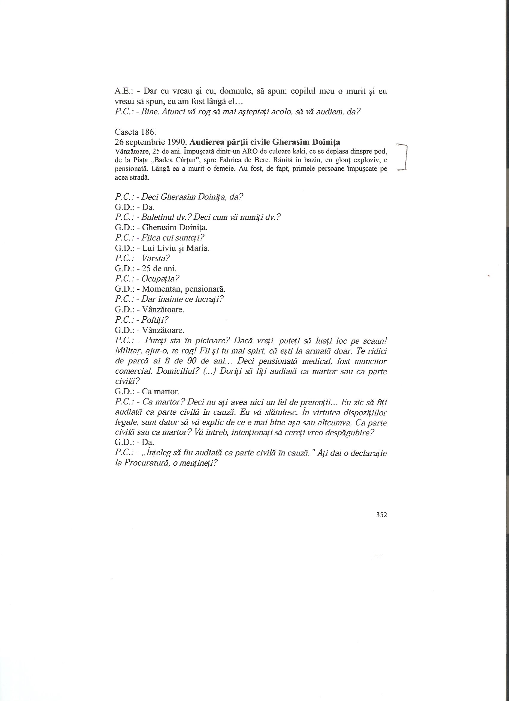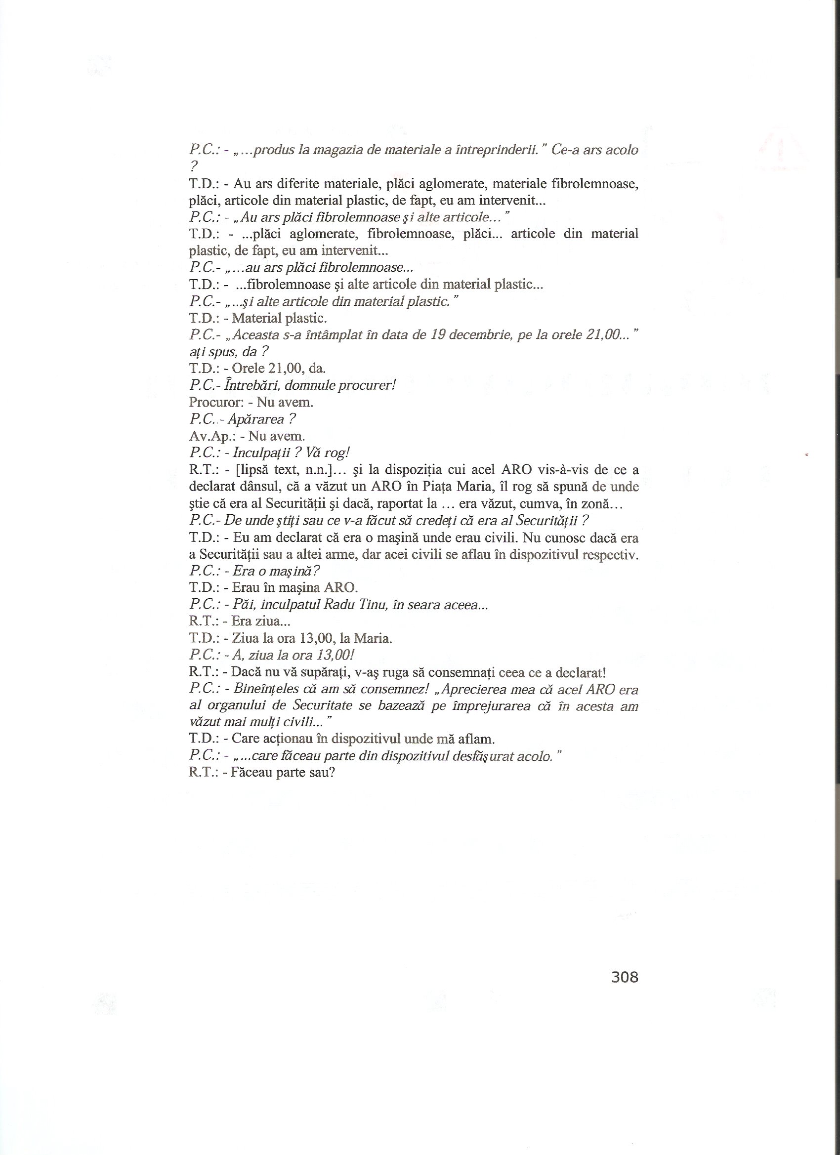 Some excerpts: P.C.: Ati dat o declaratie? Po. I. : Da P.C.: O mentineti? Po. I. Da (p. 827) P.C.: “Inteleg sa fiu audiat in cauza ca parte civila”, da? V-as ruga sa faceti putin liniste! “Mentin declaratia de la Procuratura si…” (p. 833)