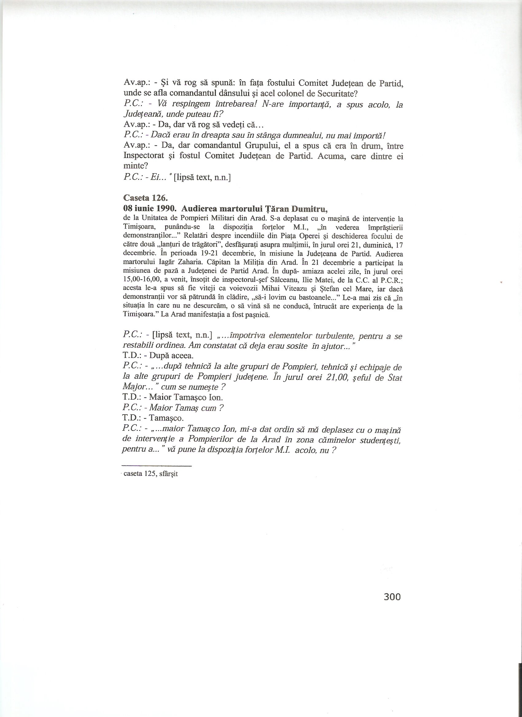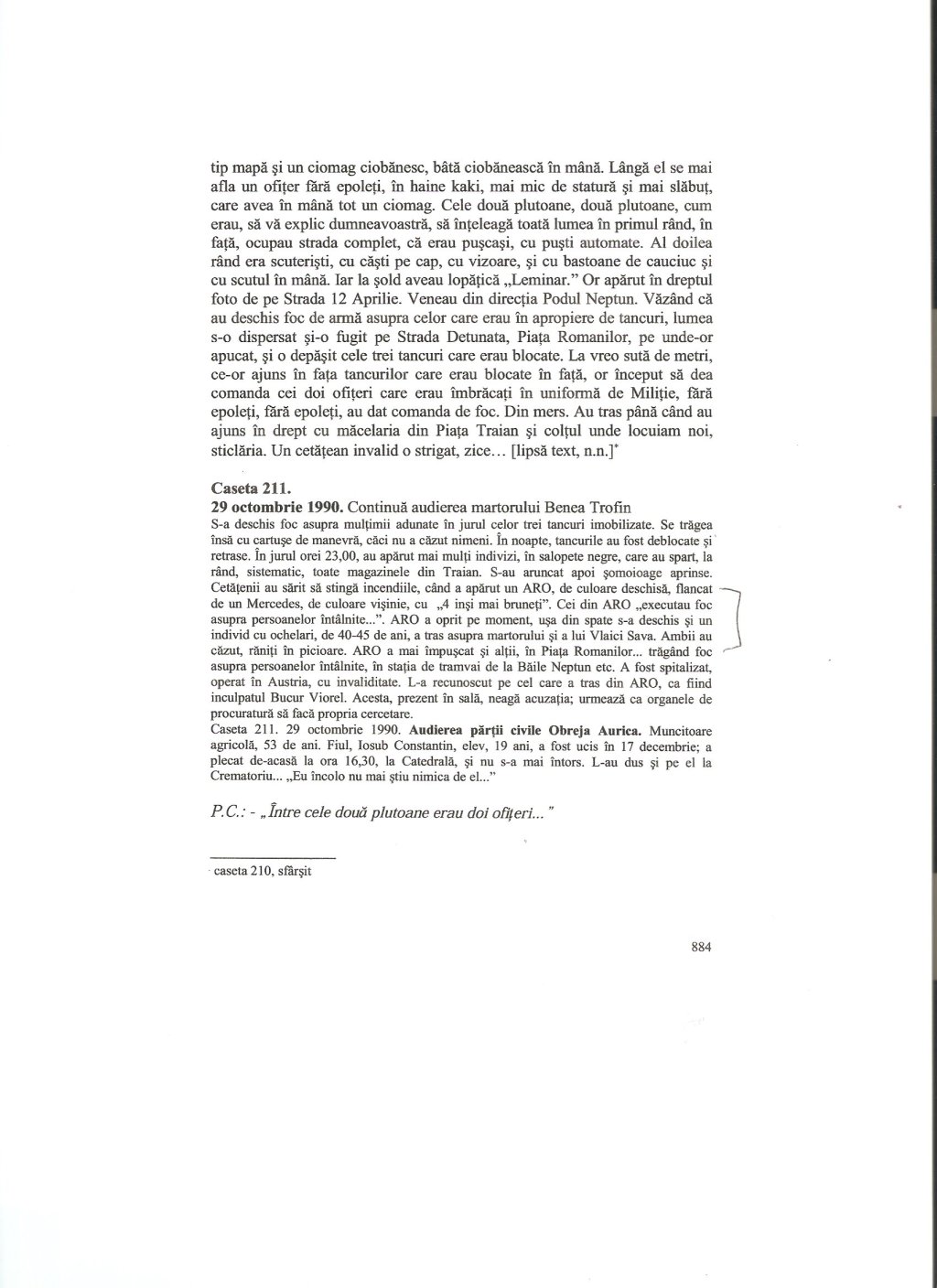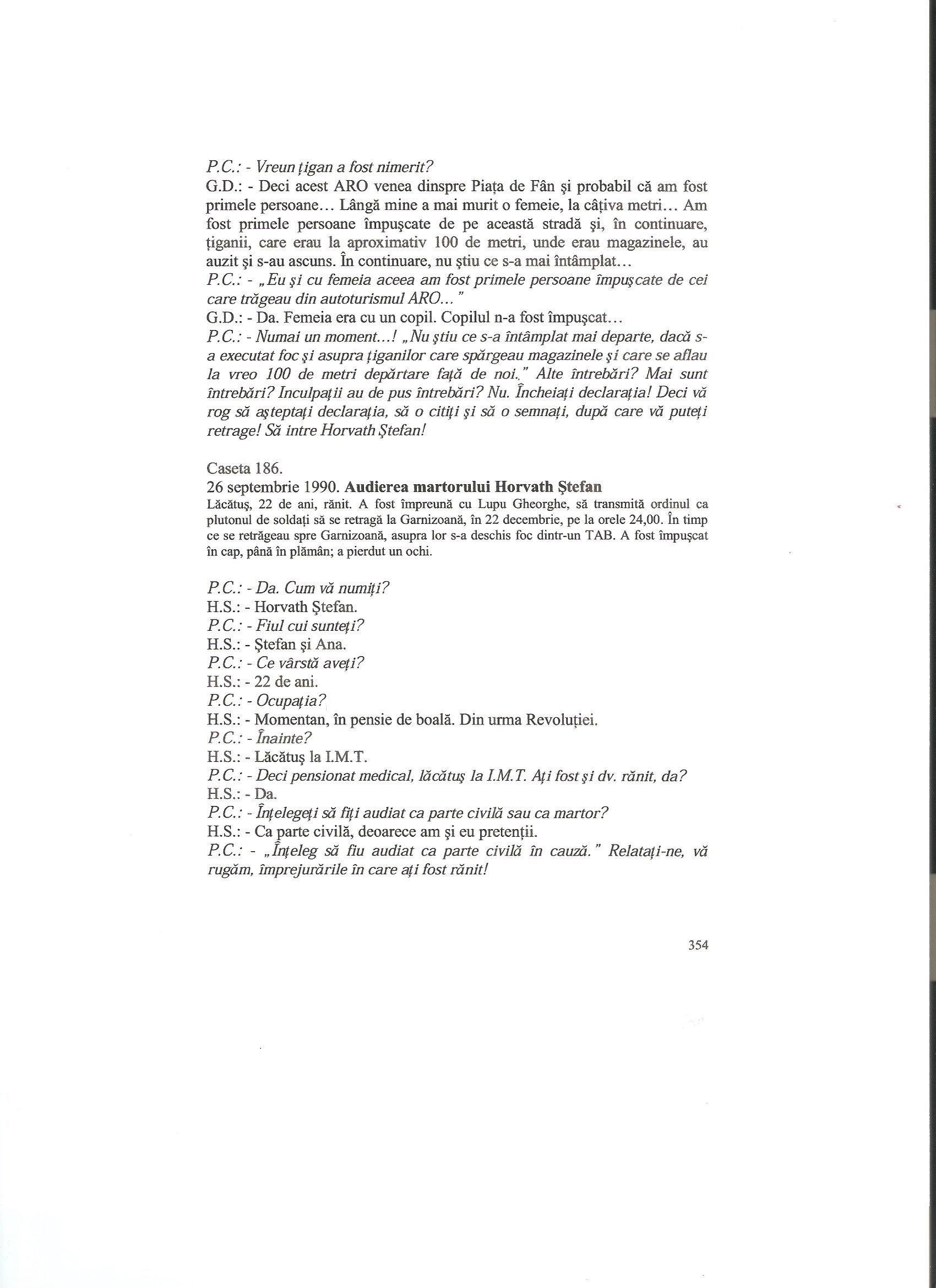 Some excerpts: P.C.: Ati dat o declaratie? Po. I. : Da P.C.: O mentineti? Po. I. Da (p. 827) P.C.: “Inteleg sa fiu audiat in cauza ca parte civila”, da? V-as ruga sa faceti putin liniste! “Mentin declaratia de la Procuratura si…” (p. 833)