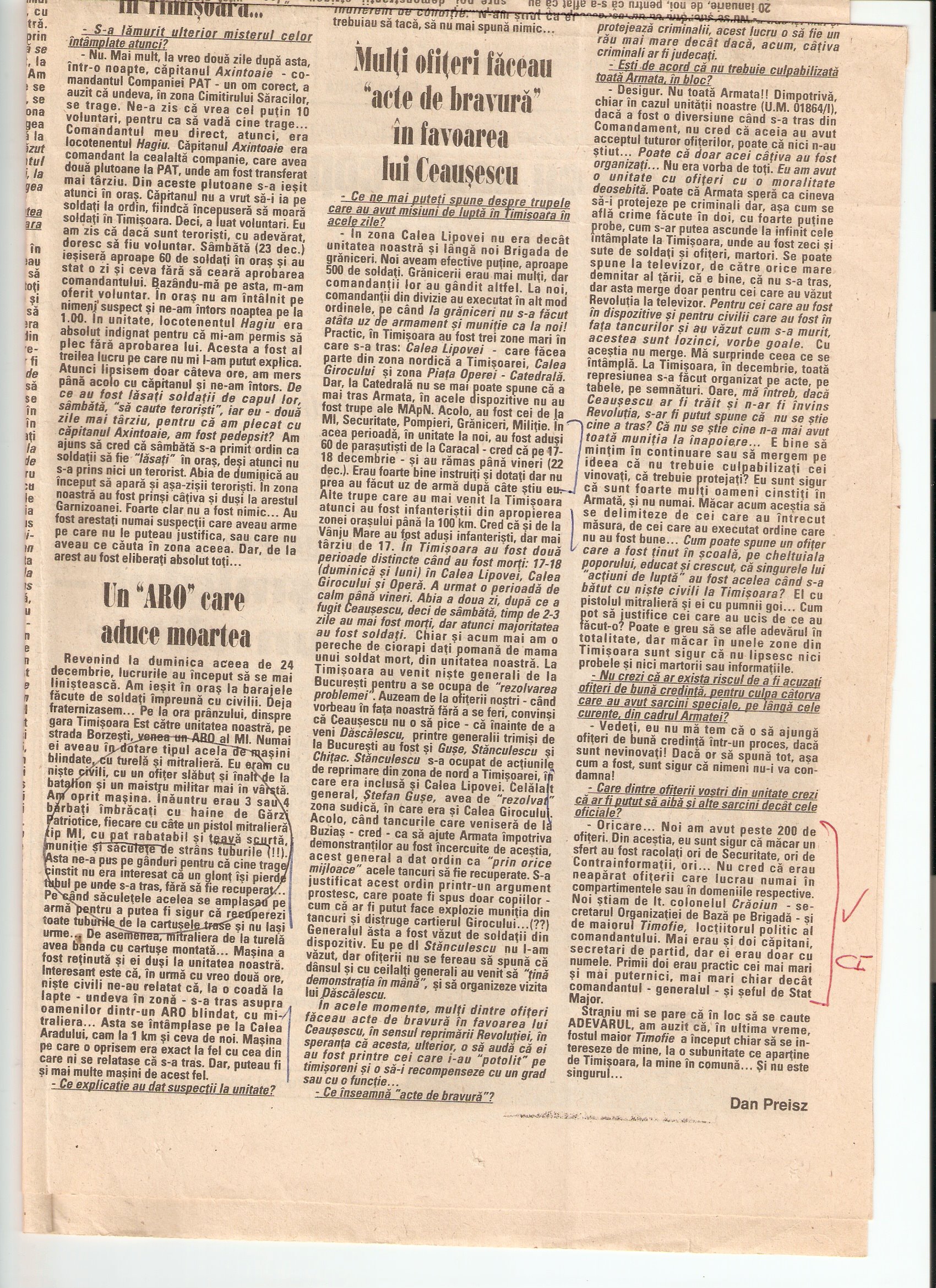 Revenind la duminica aceea de 24 decembrie, lucrurile au inceput sa se mai linisteasca. Am iesit in oras la barajele facute de soldati impreuna cu civilii. Deja fraternizasem…Pe la ora prinzului, dinspre gara Timisoara Est catre unitatea noastra, pe strada Borzesti, venea un ARO al MI. Numai ei aveau in dotare tipul acela de masini blindate [e vorba de un ABI ?], cu turela si mitraliera. Eu eram cu niste civili, cu un ofiter slabut si inalt de la batalion si un maistru militar mai in varsta. Am oprit masina. Inauntru erau 3 sau 4 barbati imbracati cu haine de Garzi Patriotice, fiecare cu cate un pistol mitraliera tip MI, cu pat ratabil si teava scurta, munitie si saculete de strans tuburile (!!). Astia ne-a pus pe ganduri pentru ca cine trage cinstit nu era interesat ca un glont isi pierde tubul pe unde s-a tras, fara sa fie recuperat…Pe cand saculetele acelea se amplasau pe arma pentru a putea fi sigur ca recuperezi toate tuburile de la cartusele trase si nu lasi urme…De asemenea, mitraliera de la turela avea banda cu cartuse montata…Masina a fost retinuta si ei dusi la unitatea noastra. Interesant este ca, in urma cu vreo doua ore, niste civili ne-au relatat ca, la o coada la lapte–undeva in zona–s-a tras asupra oamenilor dintr-un ARO blindat, cu mitraliera…Asta se intamplase pe la Calea Aradului, cam la 1 km si ceva de noi. Masina pe care o oprisem era exact la fel cu cea din care ni se relatase ca s-a tras. Dar, puteau fi si mai multe masini de acest fel.