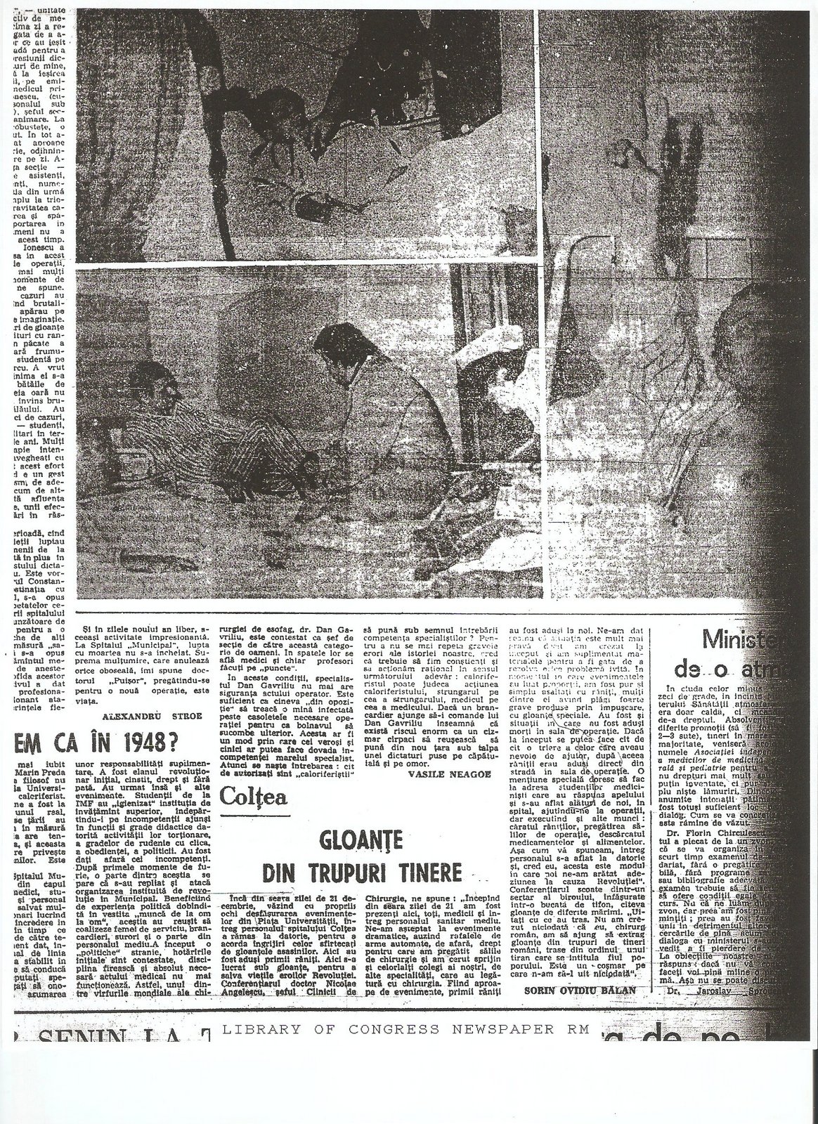Reportaj la Spitalul Militar Central: se relateaza despre modul dramatic în care au fost efectuate operatiile (chirurgicale) din ziua de 22 decembrie 1989. „Noapte alba sau zi neagra” spune doctorul pe buna dreptate. Armele teroristilor, a securistilor au împroscat multimea cu gloante explozive, care au avut ca efect plagi si leziuni gigantice.
