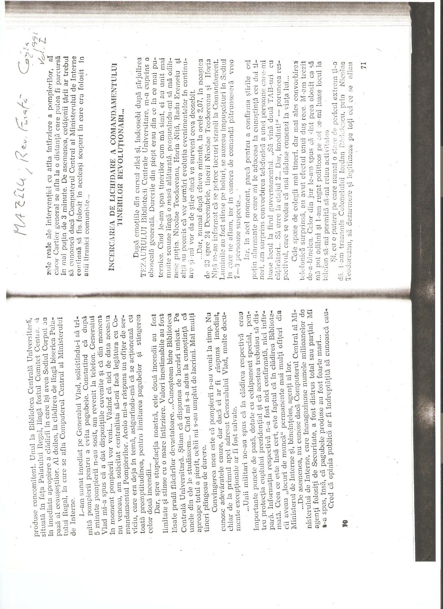 - e) Elemente din alte unitati de Securitate, inclusiv unitatile speciale 544, 195 si 110, precum si din cele complet acoperite, comandate de col. Maita, col. Valeanu, lt. col. Sirbu, col. Nica, col. Eftimie si lt. col. (Eftimie sau Anghelache) Gelu (asa sta scris in declaratie–n.n.). Aceste din urma sase unitati, ca si UM 544, in ansamblu, si UM 195 puteau dispune si de armament si munitii de provenienta straina, precum si de conditii de pregatire adecvate.