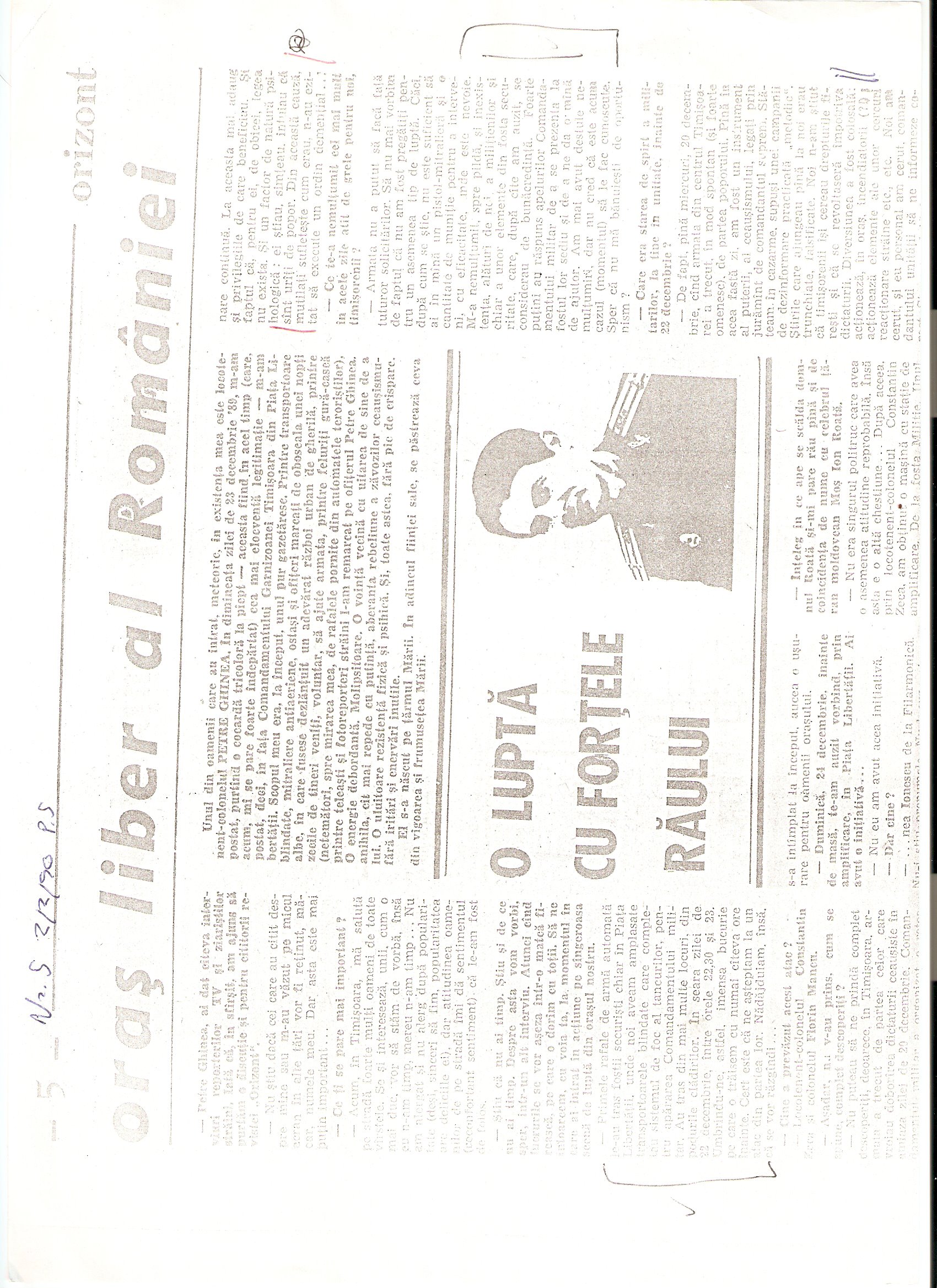 Iosif Costinas cu Locotenent-colonelul PETRE GHINEA, “O Lupta cu Fortele Raului,” Orizont (Timisoara), nr. 5 (2/2/1990), p. 5