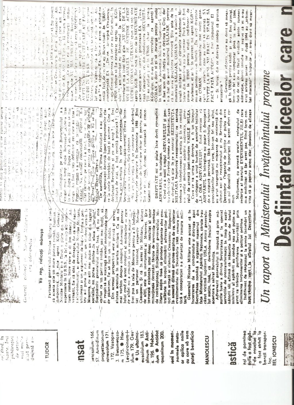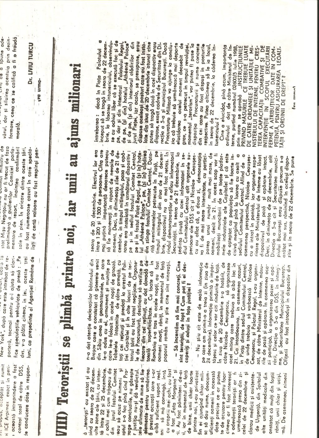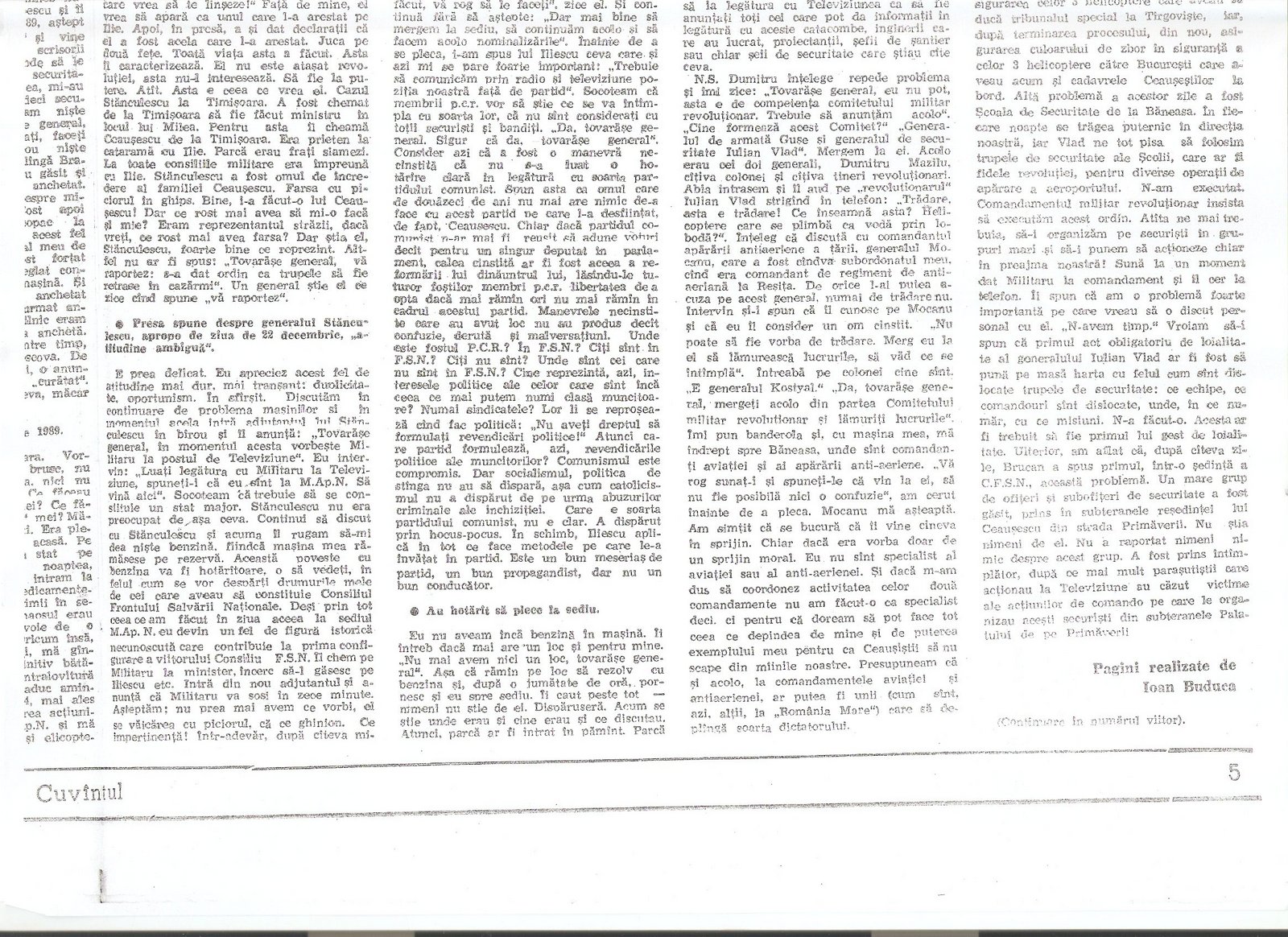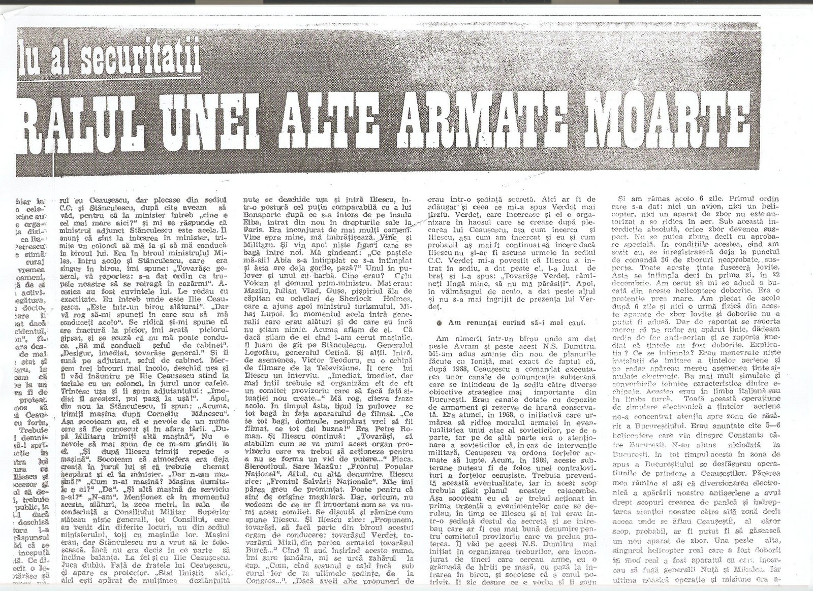 “A civilian, Gelu Voican Voiculescu, was in the office surrounded by the other generals [Army General Nicolae Militaru, Militia General Cimpeanu, Securitate General Iulian Vlad, and Securitate Fifth Directorate General Neagoe]…he began to interrogate me, ordering that my USLA commander, Colonel Ardeleanu go outside. He demanded information about the organization, make-up, and functioning of the unit, its address, what the unit’s members were doing at that moment, my personal information, after which he confronted me with Colonel Ardeleanu and asked me to identify who he was…”(“Crime care nu se prescriu,” interview with Angela Bacescu, “Europa” 28 July-5 August 1992).
