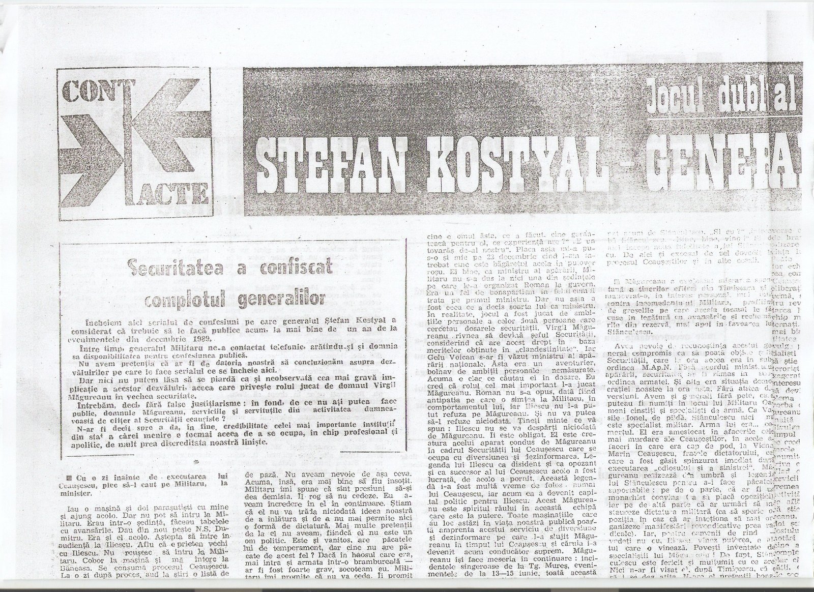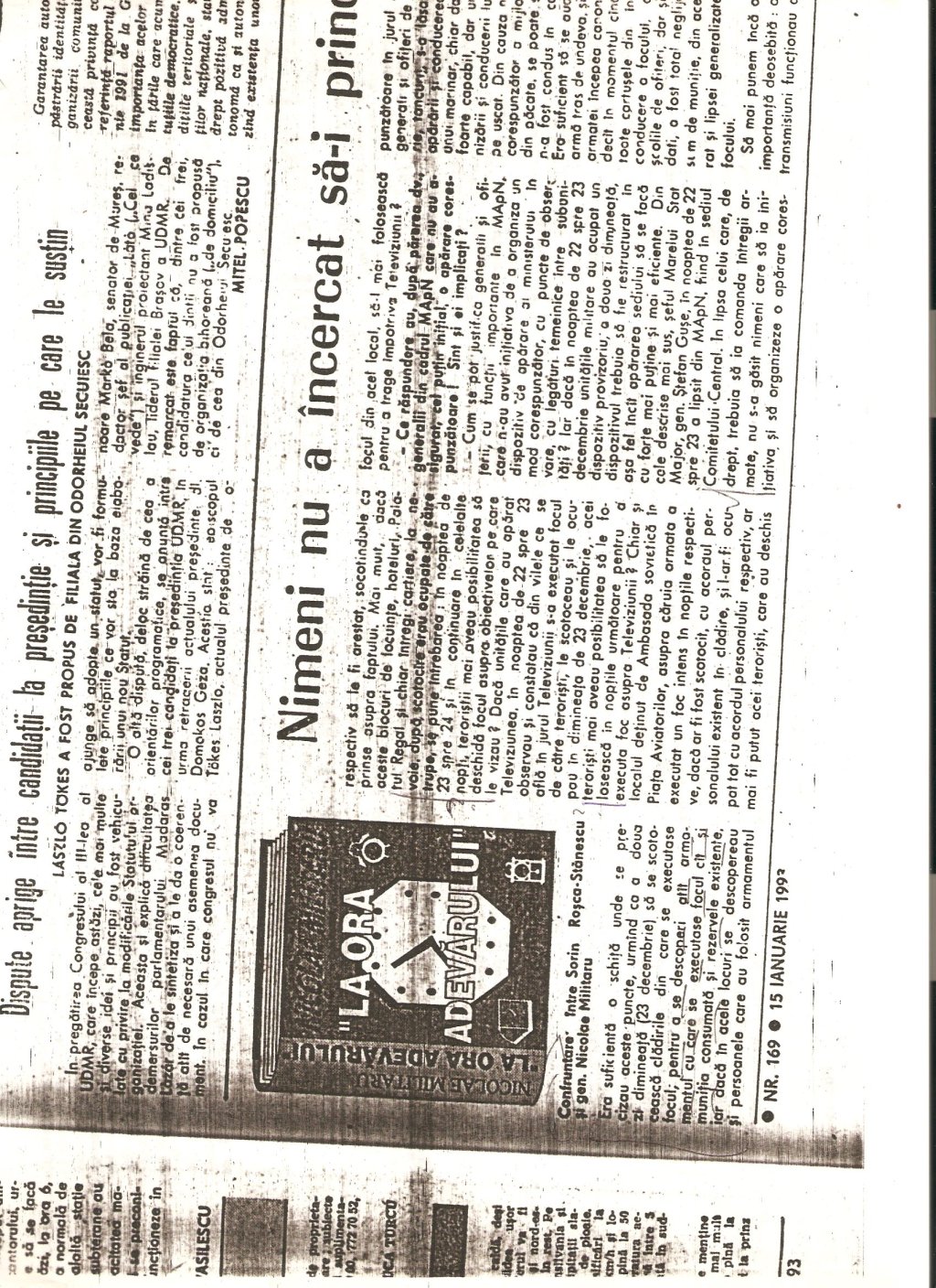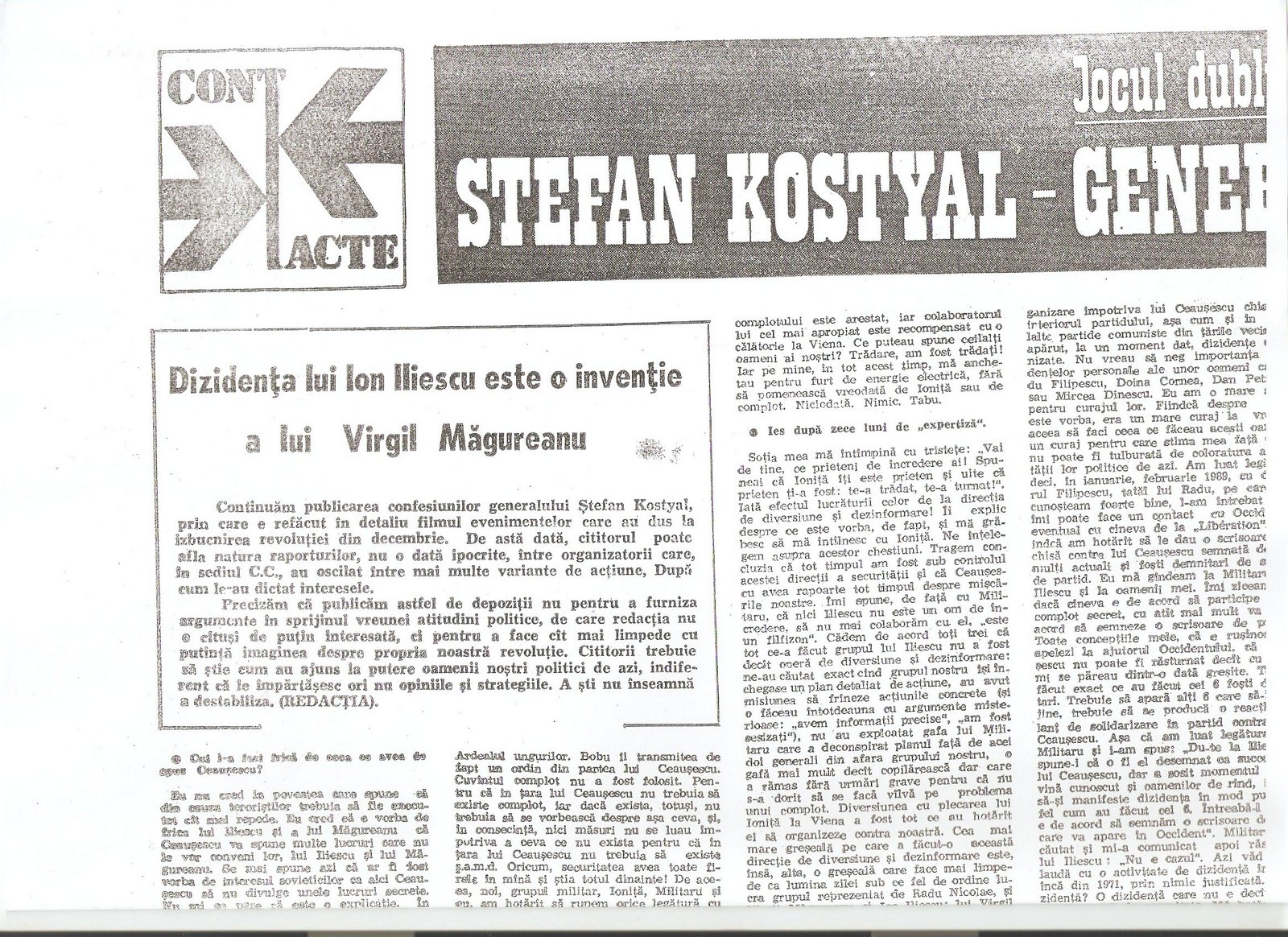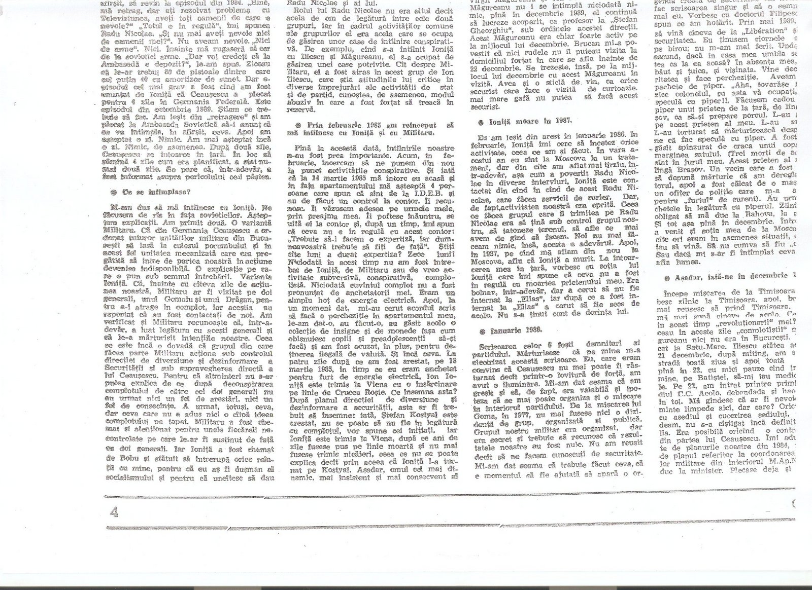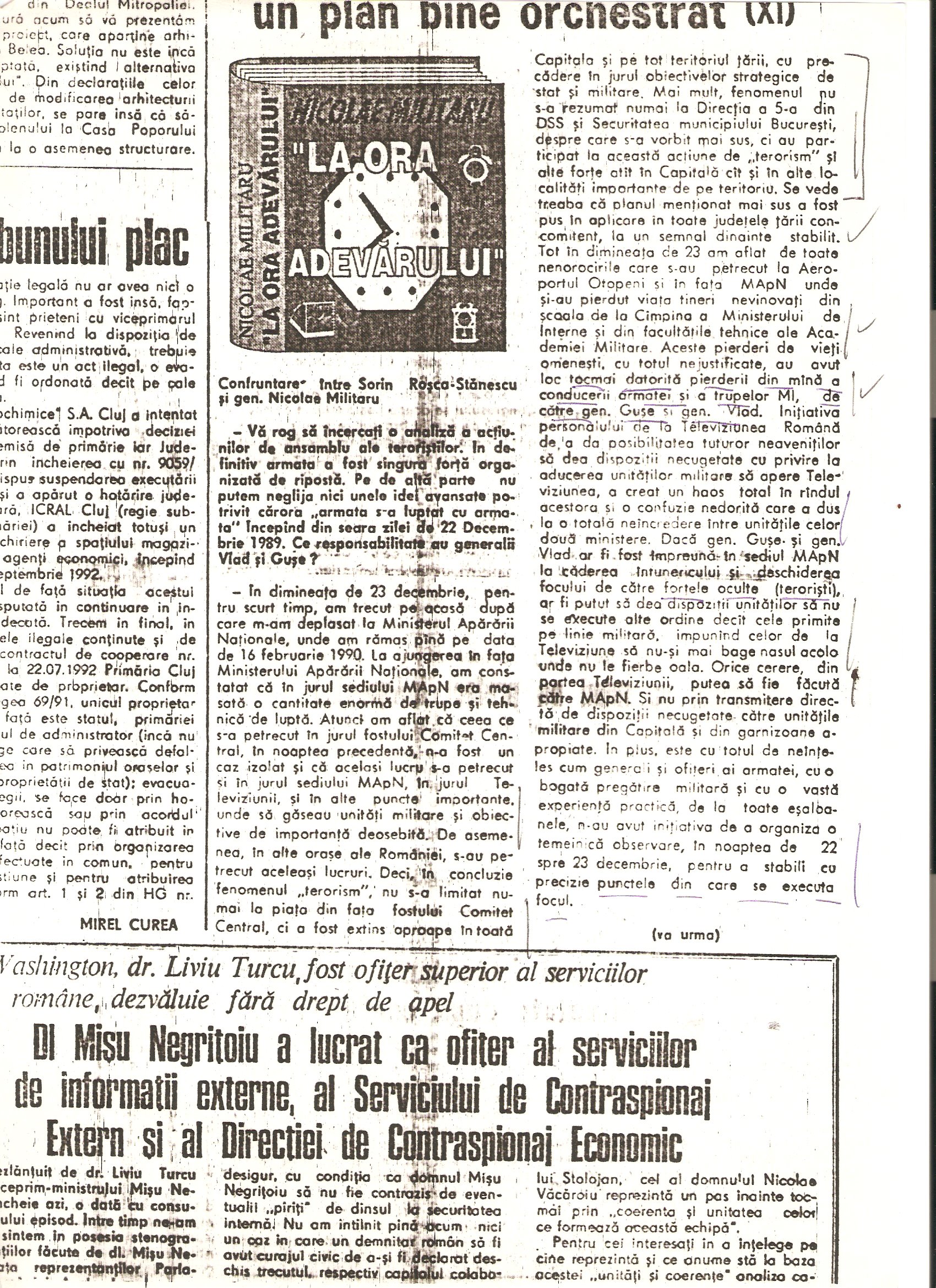 “A civilian, Gelu Voican Voiculescu, was in the office surrounded by the other generals [Army General Nicolae Militaru, Militia General Cimpeanu, Securitate General Iulian Vlad, and Securitate Fifth Directorate General Neagoe]…he began to interrogate me, ordering that my USLA commander, Colonel Ardeleanu go outside. He demanded information about the organization, make-up, and functioning of the unit, its address, what the unit’s members were doing at that moment, my personal information, after which he confronted me with Colonel Ardeleanu and asked me to identify who he was…”(“Crime care nu se prescriu,” interview with Angela Bacescu, “Europa” 28 July-5 August 1992).