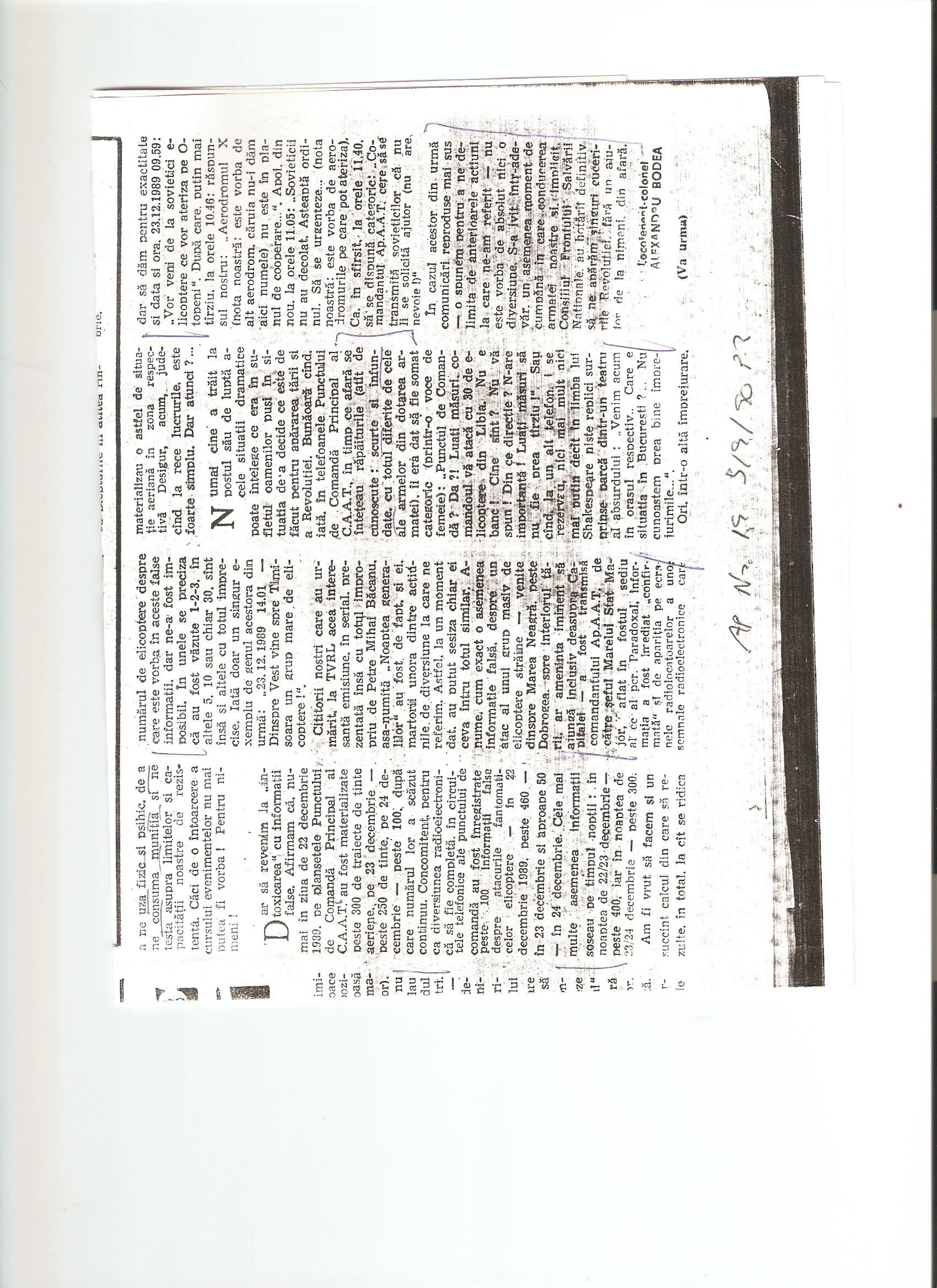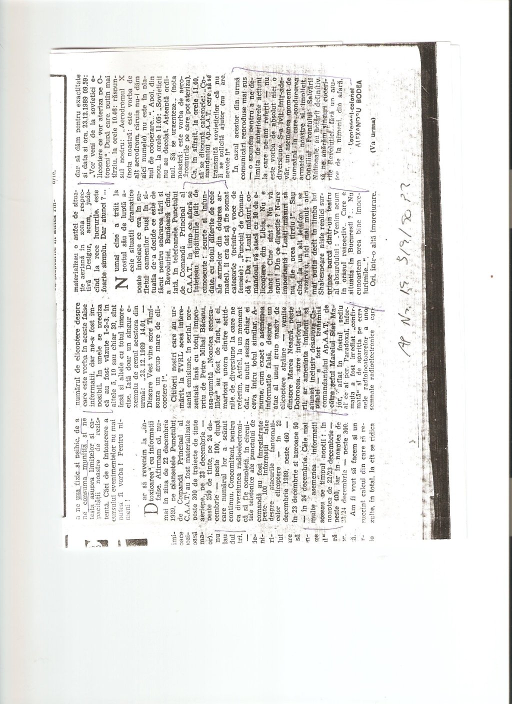 - e) Elemente din alte unitati de Securitate, inclusiv unitatile speciale 544, 195 si 110, precum si din cele complet acoperite, comandate de col. Maita, col. Valeanu, lt. col. Sirbu, col. Nica, col. Eftimie si lt. col. (Eftimie sau Anghelache) Gelu (asa sta scris in declaratie–n.n.). Aceste din urma sase unitati, ca si UM 544, in ansamblu, si UM 195 puteau dispune si de armament si munitii de provenienta straina, precum si de conditii de pregatire adecvate.