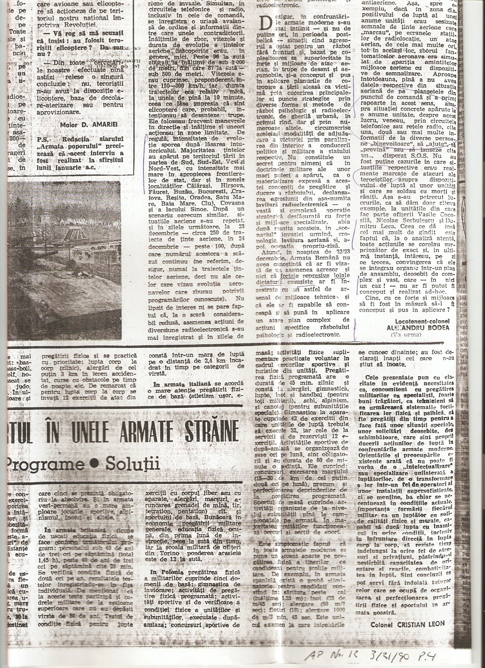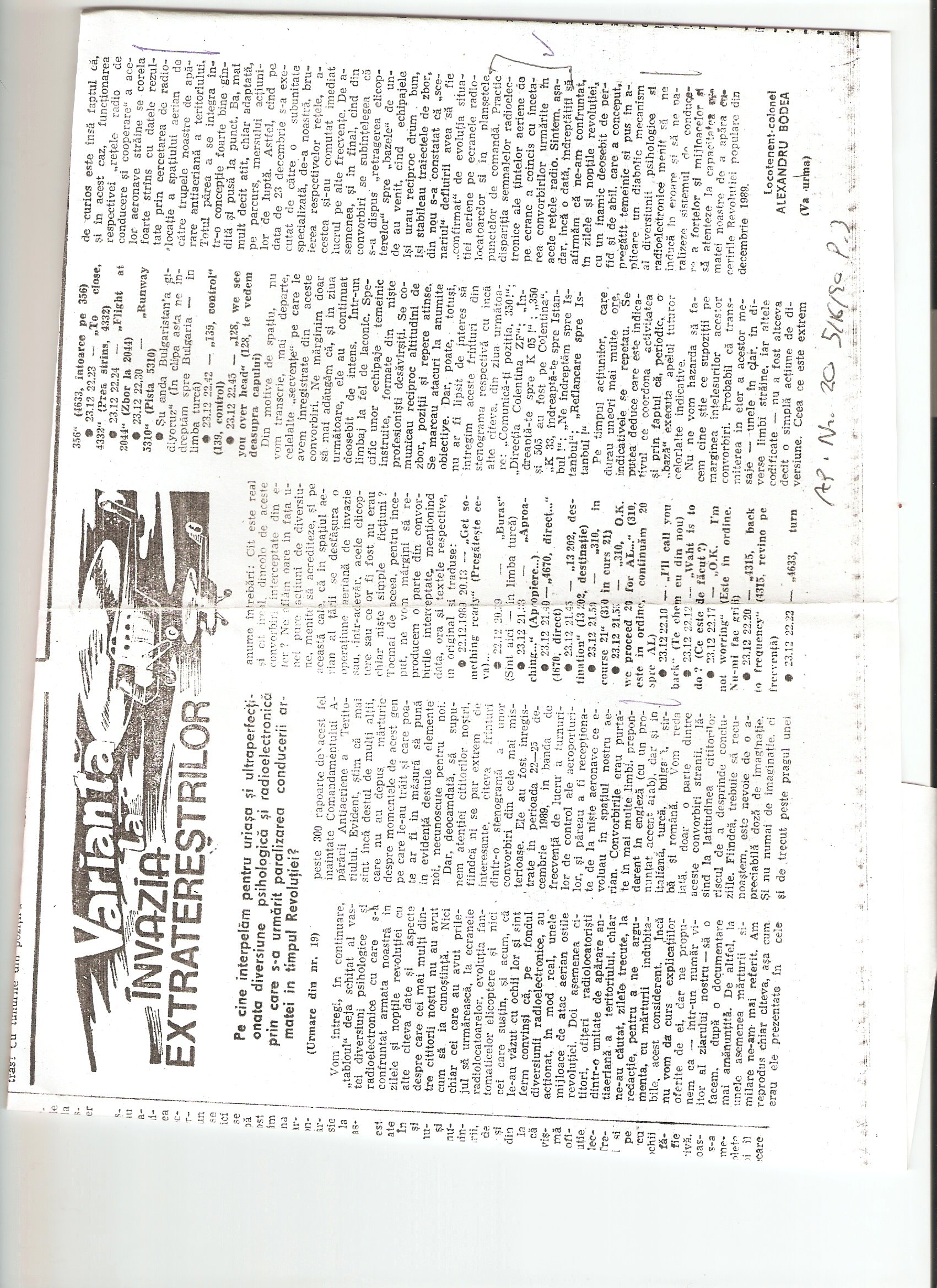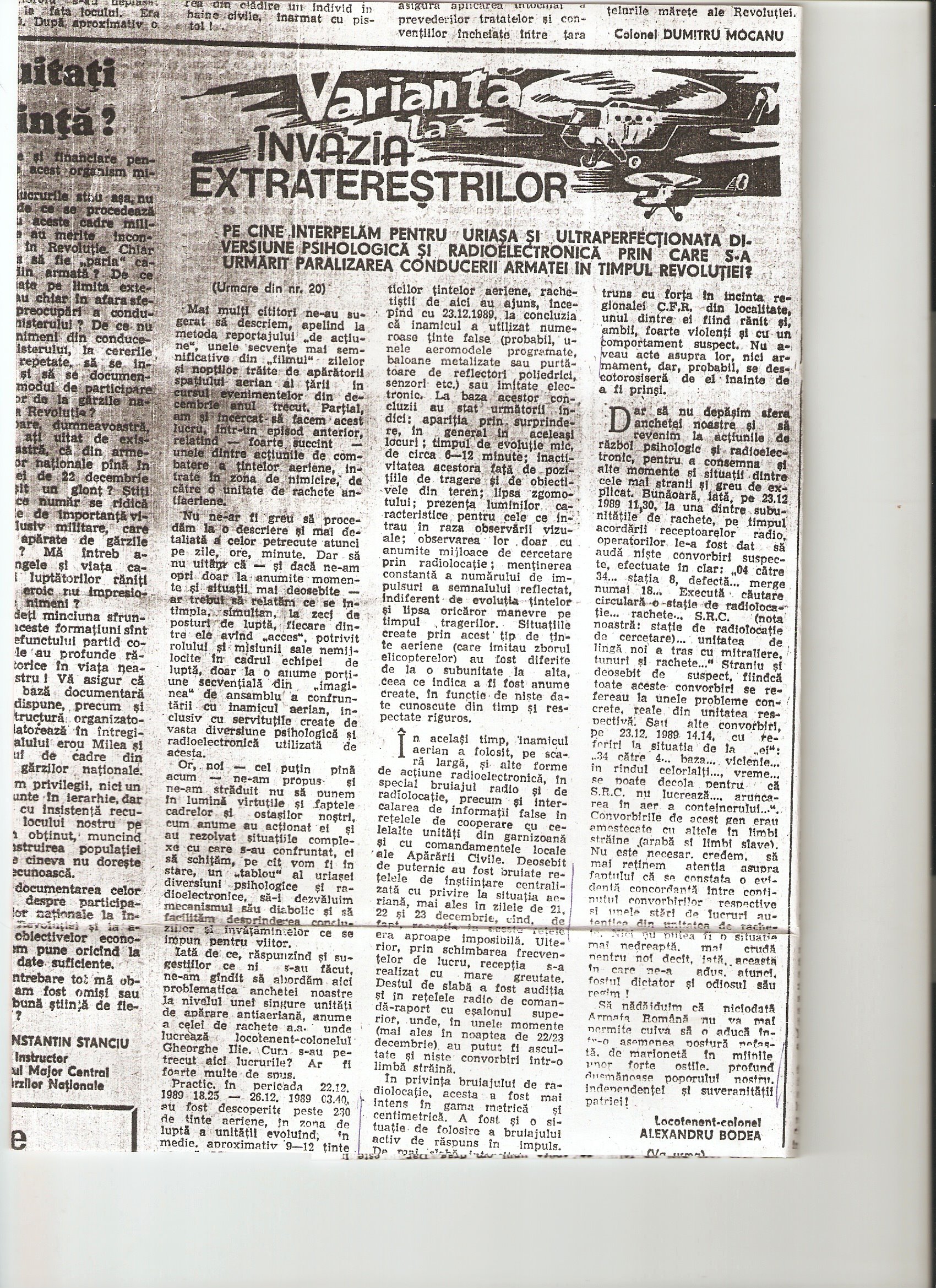 (Locotenent-colonel Alexandru Bodea, din serialul “Varianta la Invazia Extraterestrilor. Pe cine interpelam pentru uriasa si ultraperfectionata diversiune psihologica si radioelectronica prin care s-a urmarit paralizarea conducerii armatei in timpul Revolutiei?” Armata Poporului, nr. 22 (“urmare din numarul 21″), 30 mai 1990. Xerox-ul facut in anul 1994 la Biblioteca Academiei Romane).