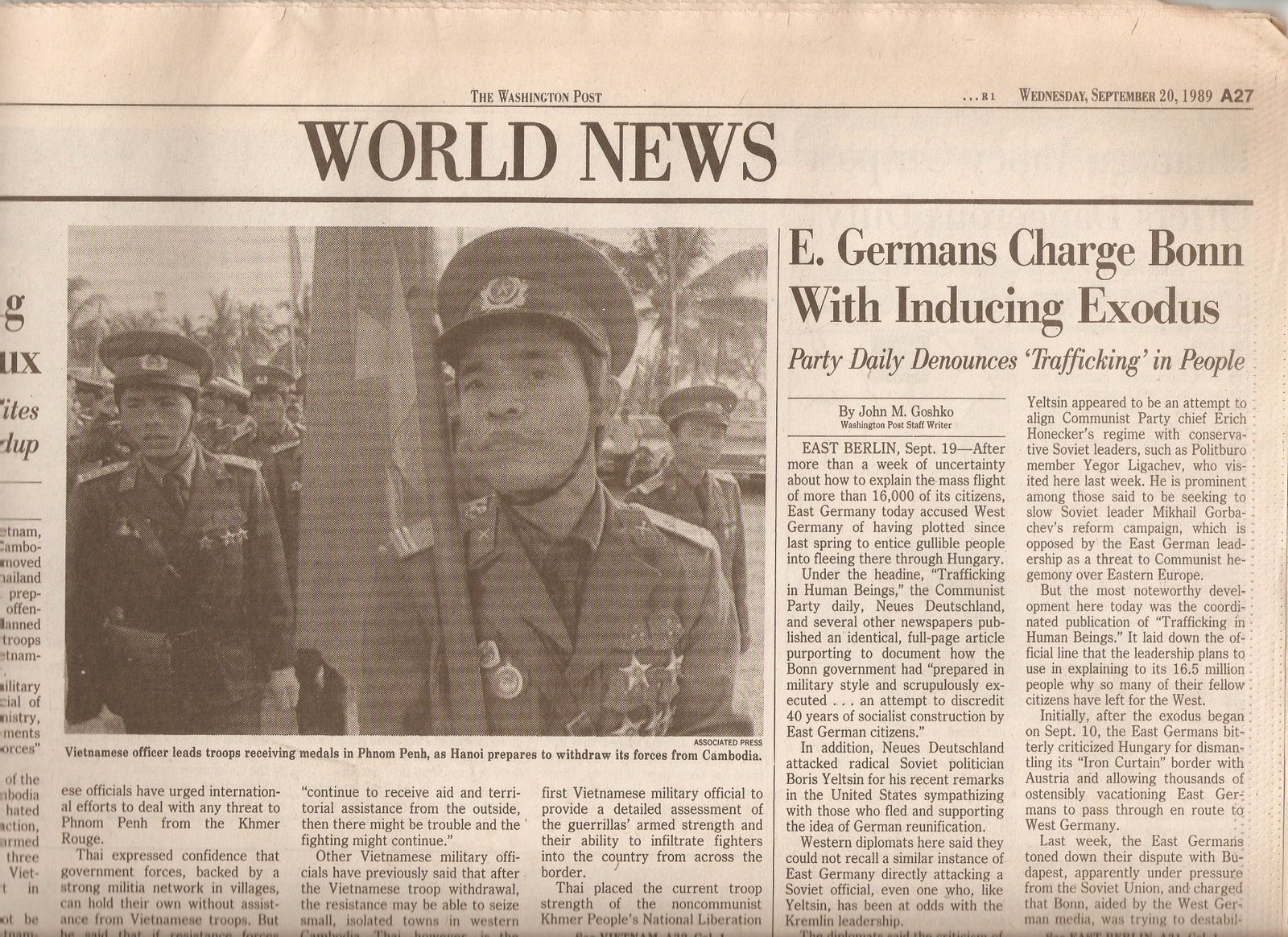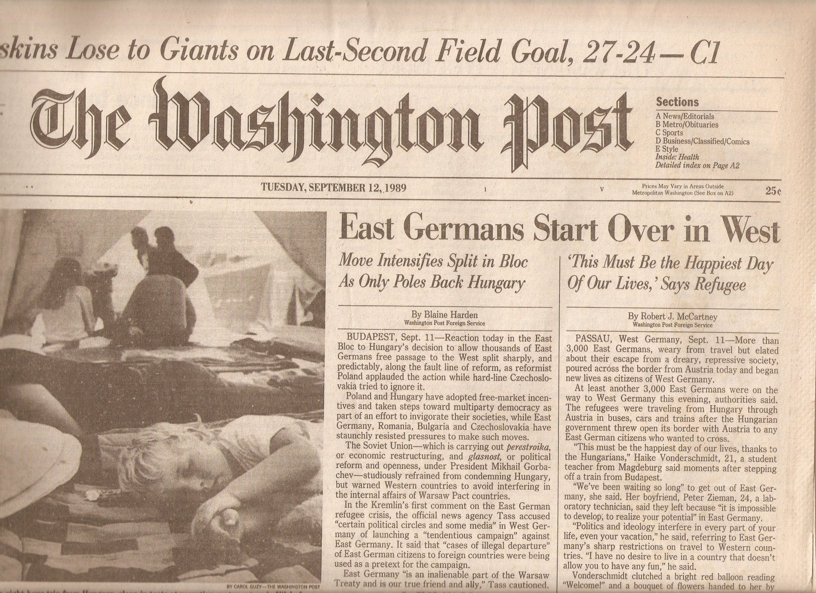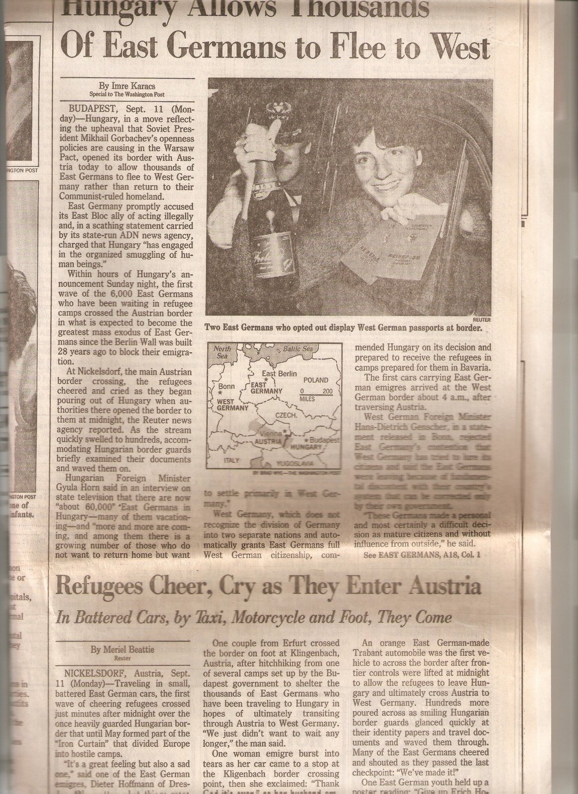 PURELY PERSONAL VIEWS AS ALWAYS. As my own collection of copies of the Washington Post from the time suggests: things began to really gather pace in the former communist Eastern Europe in September 1989. On 11 September 1989–yes 11 September, the accidental historian thus drawing together other famous 11 Septembers (Allende’s overthrow in Chile in 1973 or al-Qa’ida’s horrific attacks of 11 September 2001)–the Hungarians essentially formalized their laissez-faire attitude toward East Germans using their country as a transit point for going West. To the wrath of the East German regime of Erich Honecker–but also to the other members of the so-called Gang of Four rejectionists in Czechoslovakia, Bulgaria, and perhaps especially Nicolae Ceausescu’s Romania–the Hungarian regime released the pressure of the build-up of East German refugees in their country, opening the flood gates not only for future refugees but for the momentous collapse of the rejectionist communist regimes which followed in quick succession during October, November, and December 1989. Mark Kramer of Harvard University’s Cold War Studies Project lays out in excellent detail the dynamics and ramifications of these events in Mark Kramer, “The Demise of the Soviet Bloc.” The Journal of Modern History 83:4 (December 2011): 788-854, available online here (see pages 227-234): http://www.ustrcr.cz/data/pdf/seminare/2013/kramer/demise-of-the-soviet-bloc.pdf