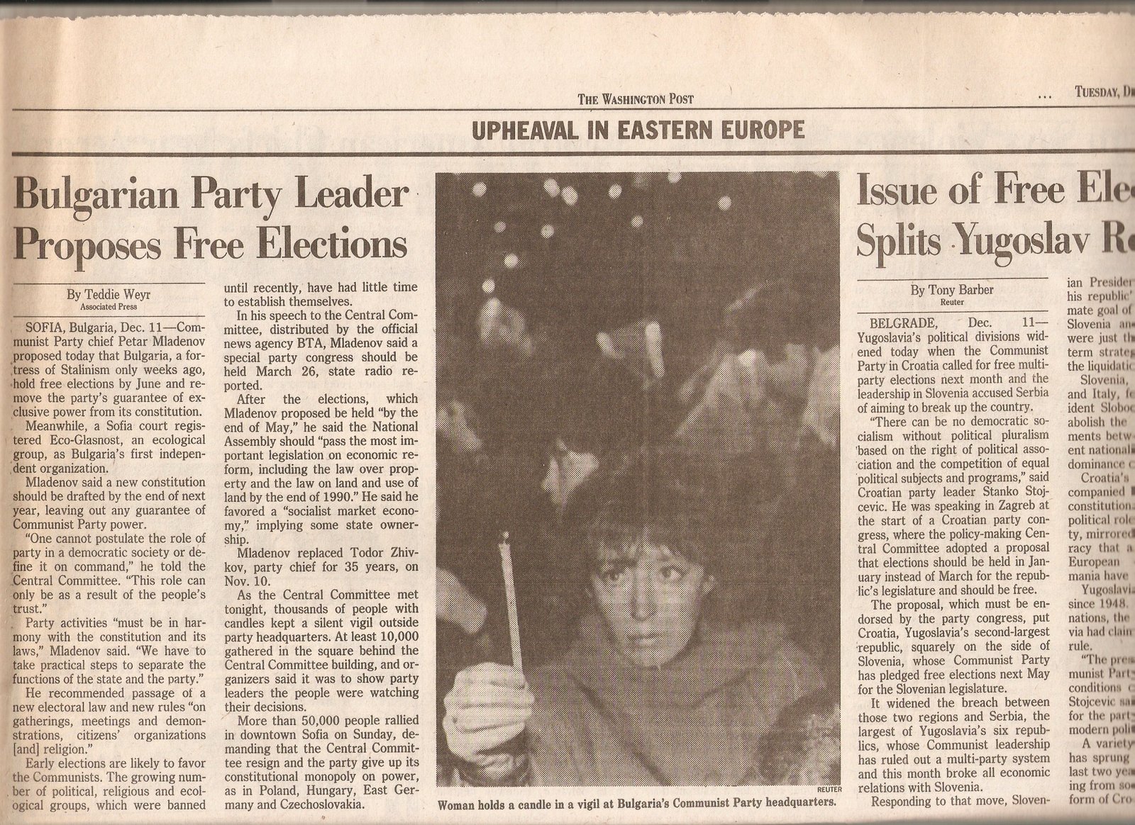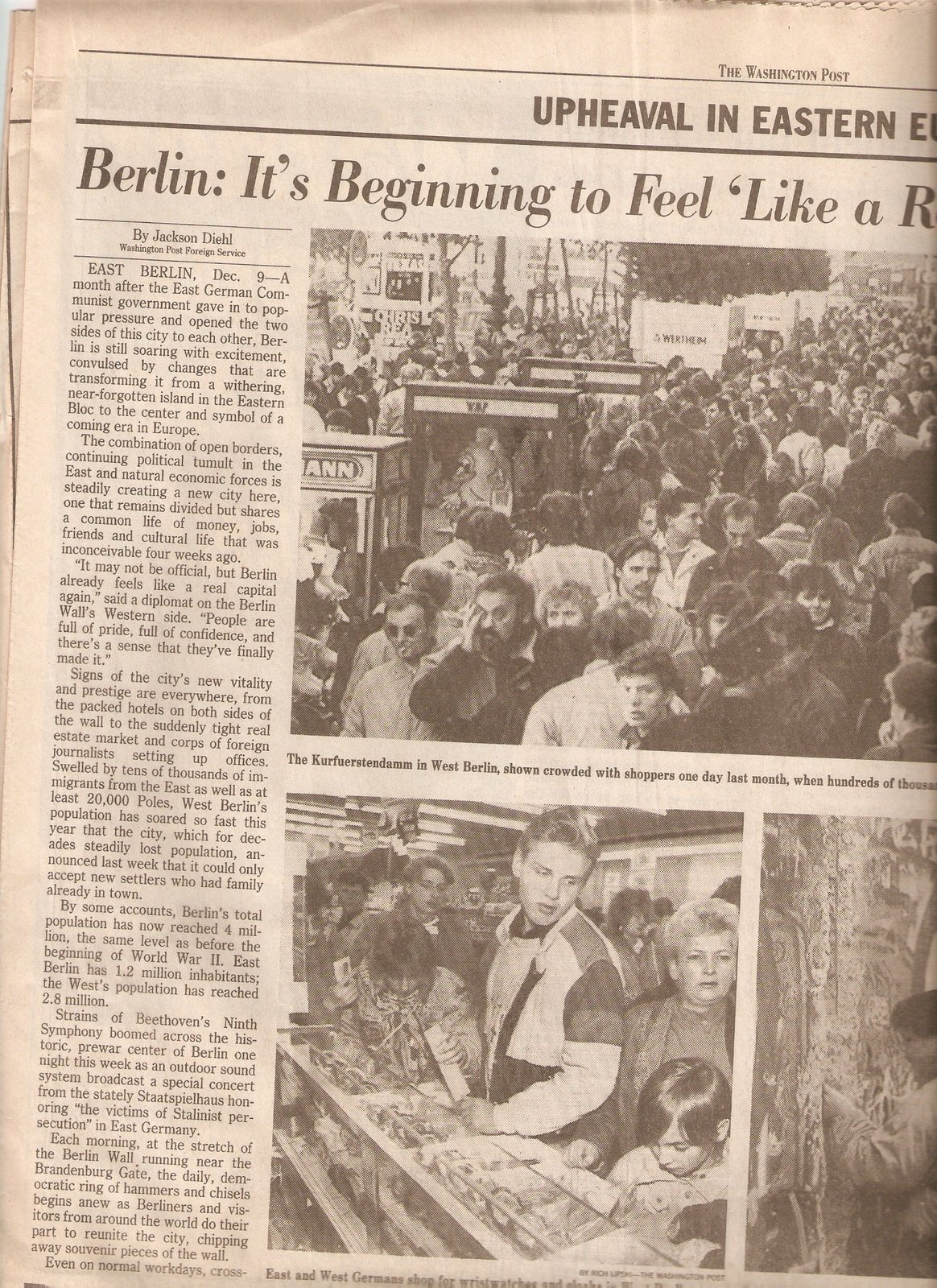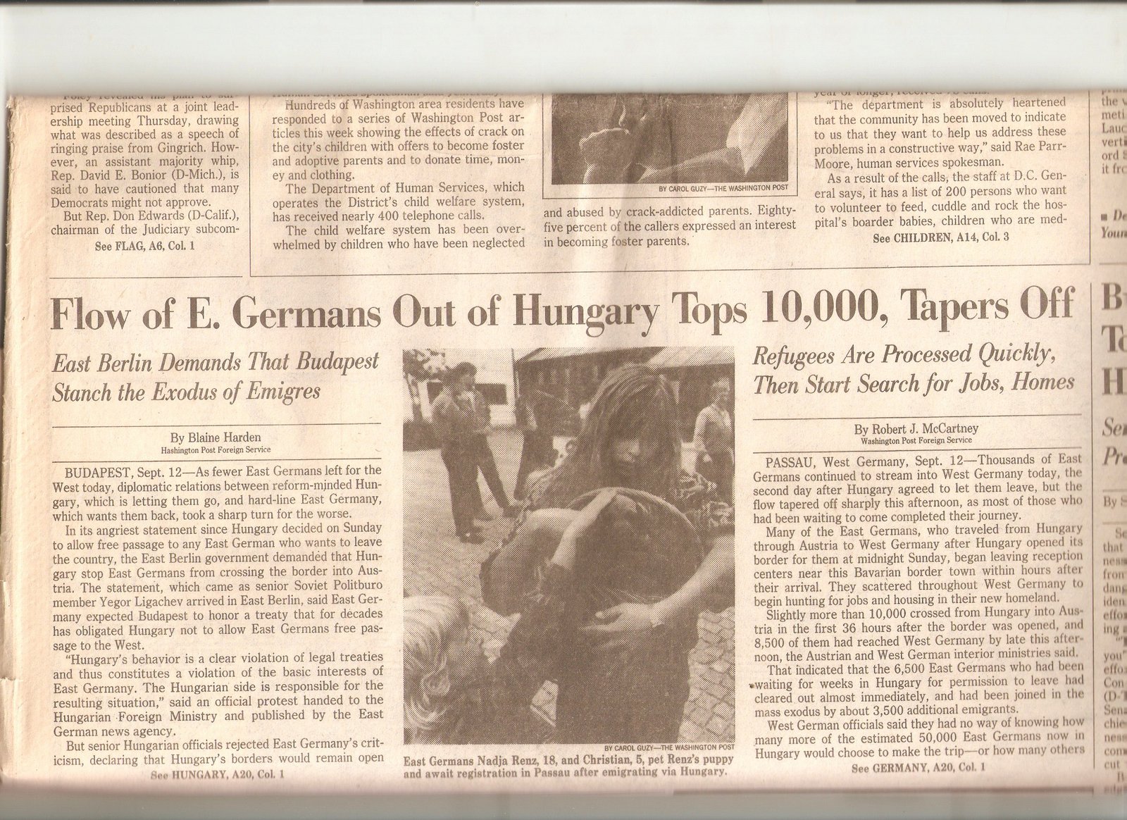 PURELY PERSONAL VIEWS AS ALWAYS. As my own collection of copies of the Washington Post from the time suggests: things began to really gather pace in the former communist Eastern Europe in September 1989. On 11 September 1989–yes 11 September, the accidental historian thus drawing together other famous 11 Septembers (Allende’s overthrow in Chile in 1973 or al-Qa’ida’s horrific attacks of 11 September 2001)–the Hungarians essentially formalized their laissez-faire attitude toward East Germans using their country as a transit point for going West. To the wrath of the East German regime of Erich Honecker–but also to the other members of the so-called Gang of Four rejectionists in Czechoslovakia, Bulgaria, and perhaps especially Nicolae Ceausescu’s Romania–the Hungarian regime released the pressure of the build-up of East German refugees in their country, opening the flood gates not only for future refugees but for the momentous collapse of the rejectionist communist regimes which followed in quick succession during October, November, and December 1989. Mark Kramer of Harvard University’s Cold War Studies Project lays out in excellent detail the dynamics and ramifications of these events in Mark Kramer, “The Demise of the Soviet Bloc.” The Journal of Modern History 83:4 (December 2011): 788-854, available online here (see pages 227-234): http://www.ustrcr.cz/data/pdf/seminare/2013/kramer/demise-of-the-soviet-bloc.pdf