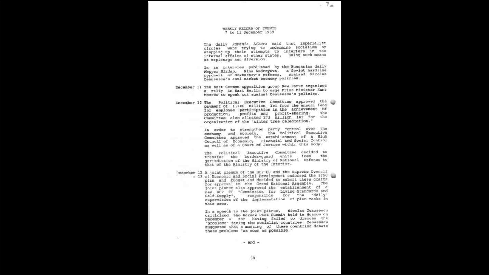 Significantly, these military after-action reports were not prepared for public dissemination and debate; they were not designed to influence public opinion. Moreover, they were drafted after the heat and confusion of December 1989 had died down, months after the events, when cooler heads and analysis could prevail. Arguments thus that the military was trying to redeem itself in the eyes of the population because of its participation in the bloody repression prior to 22 December 1989 fall by the wayside when one understands that these analyses were for restricted, internal consumption and study alone [such an argument is common, even among Western academics, see, for example, Peter Siani-Davies, The Romanian Revolution of December 1989 (2005), p. 286].