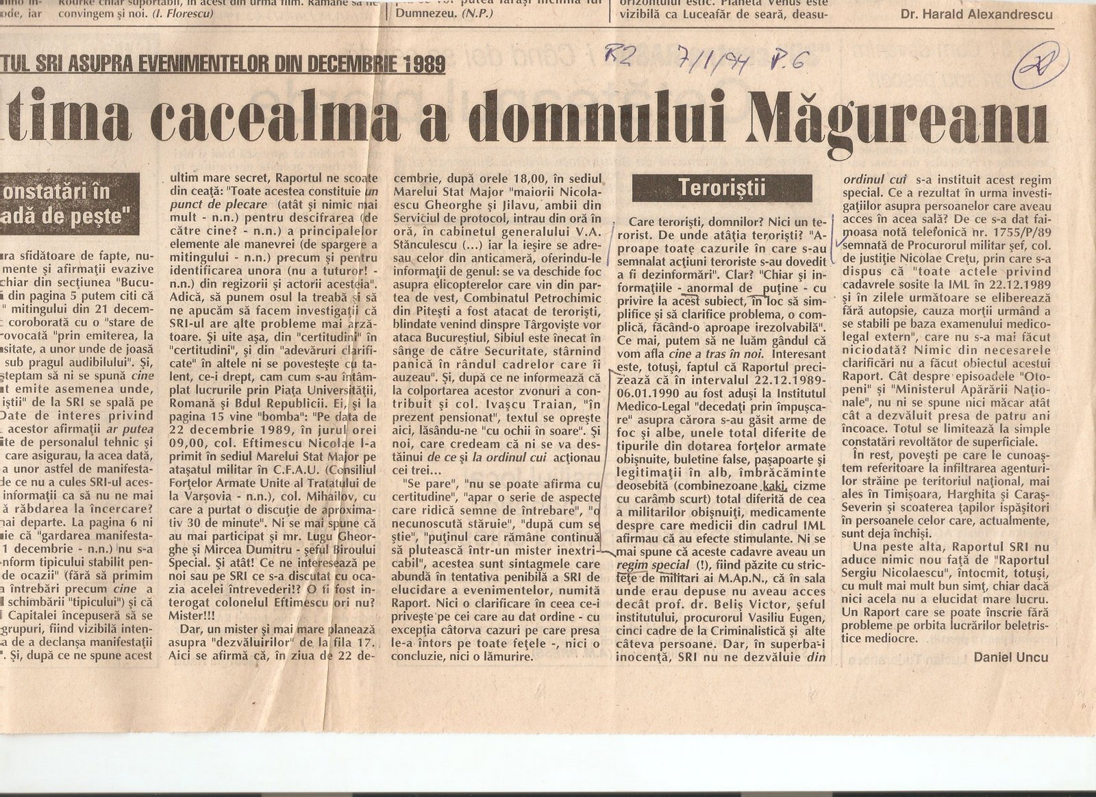 “In jurul orei 02,30 a fost impuscat, din spate, de 2 gloante de provenienta straina–unul in cap si unul in omoplatul sting. Se presupune ca s-a tras cu arme de constructie speciala, foarte eficiente si pe timp de noapte.” Armata Poporului, p. 3, nr. 41 (44) Octombrie 1990.