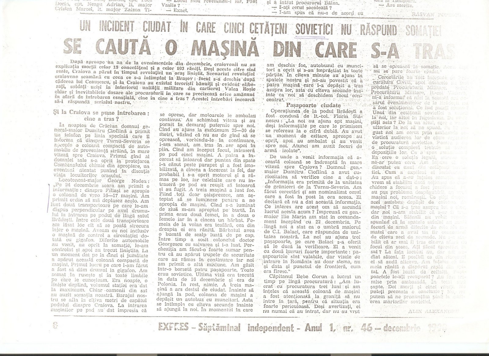 Alin Alexandru, “Un incident ciudat in care cinci cetateni sovietici nu raspund somatiei.  SE CAUTA O MASINA DIN CARE S-A TRAS,” Expres nr. 46 decembrie 1990, p. 6.