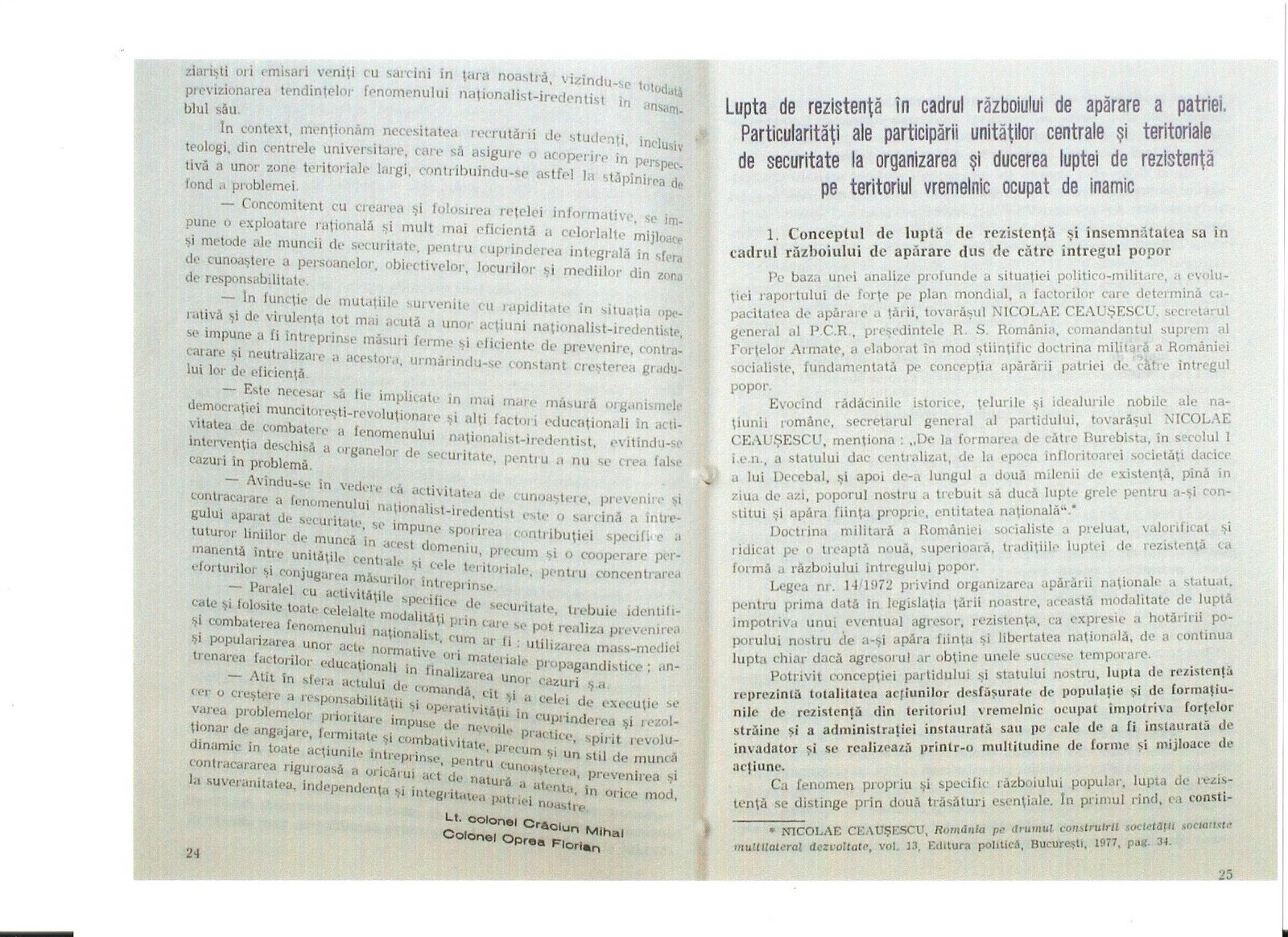 Am adauga ca, in conceptia doctrinara referitoare la apararea patriei de catre intregul popor, elaborata ‘sub obladuirea fostului comandant suprem’ a existat, atit sub aspect teoretic, metodologic, cit si practic, o sustinuta preocupare, mai ales in ultimii ani, pentru fundamentarea conceptului de ‘razboi de rezistenta’ si de pregatire, inca din timp de pace, a unor formatiuni ‘de rezistenta’ si a unor ‘zone libere’ si raioane de pe teritoriu in care, in cazul ocuparii unor parti din teritoriul national, vor actiona asa-zise ‘grupuri sau detasamente de rezistenta.’