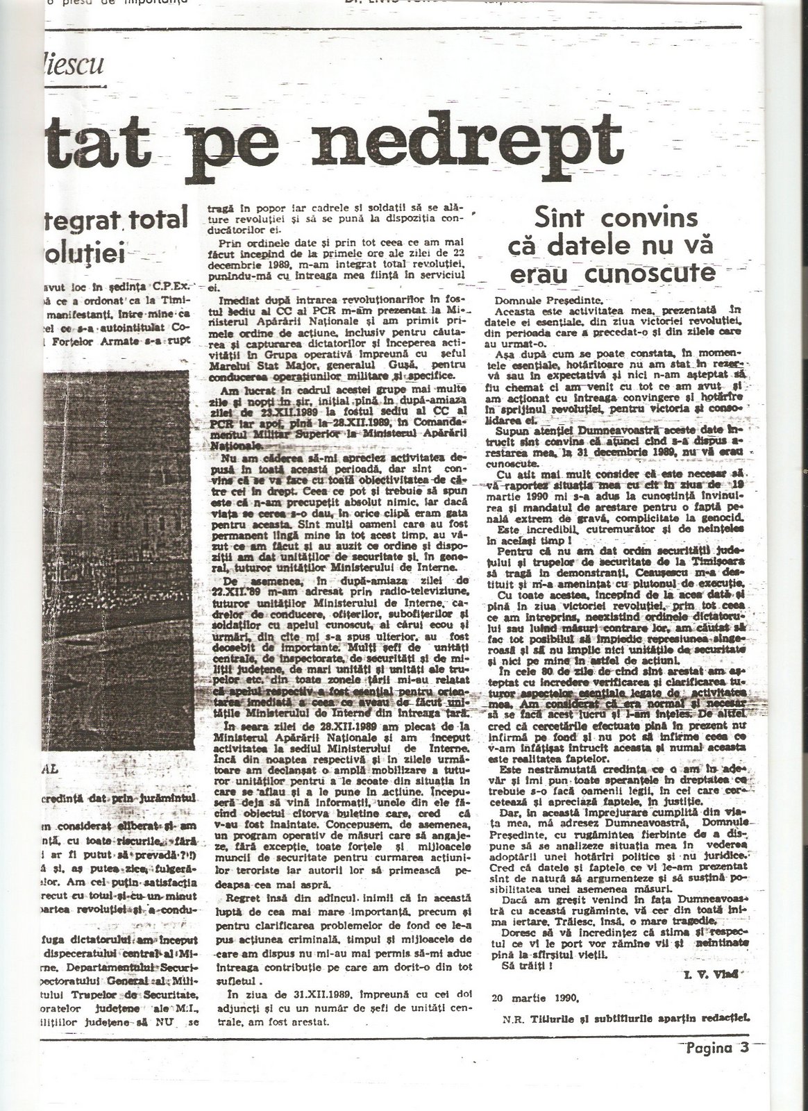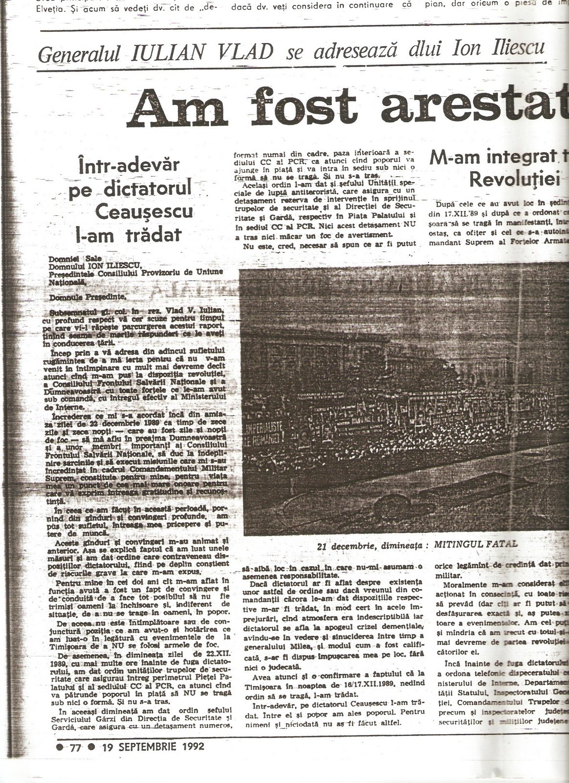 “Generalul IULIAN VLAD se adreseaza dlui Ion Iliescu: Am fost arestat pe nedrept (20 March 1990),” Evenimentul Zilei, 19 septembrie 1992, p. 3. “Intr-adevar pe dictatorul Ceausescu l-am tradat” “M-am integrat total Revolutiei” “Sint convins ca datele nu va erau cunoscute” I.V. Vlad 20 martie 1990