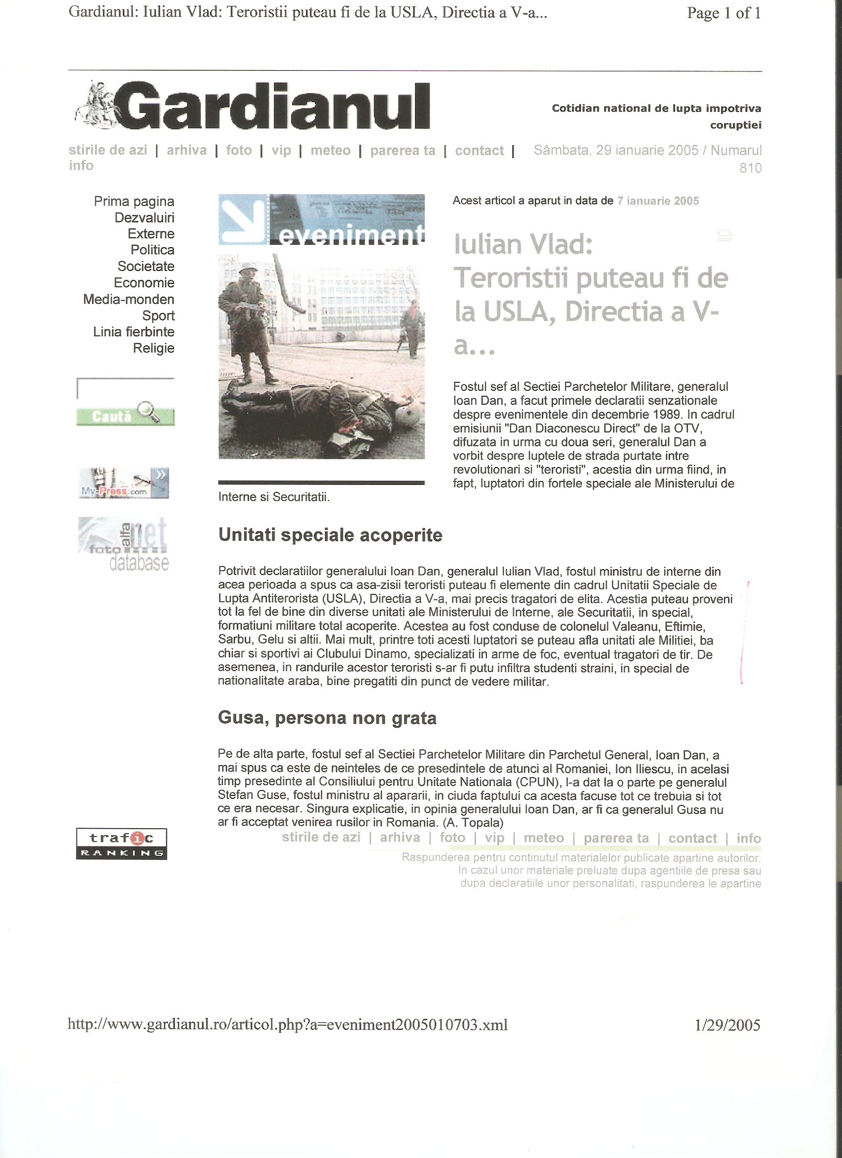 Într-un reportaj, difuzat chiar ieri de B1, și care conține filmări din perioada 22-26 decembrie 1989, se aude generalul Vlad atunci când lui Gușe i se raportează că au fost doborâte opt elicoptere de către armată, care nu aparțineau MApN, dar care erau ale unor teroriști „din interior” (nu trecuseră granița): „Ale cui sunt, domnule? Ale domnului Gușe nu sunt, ai mei nu sunt, și la Interne au doar trei elicoptere”.