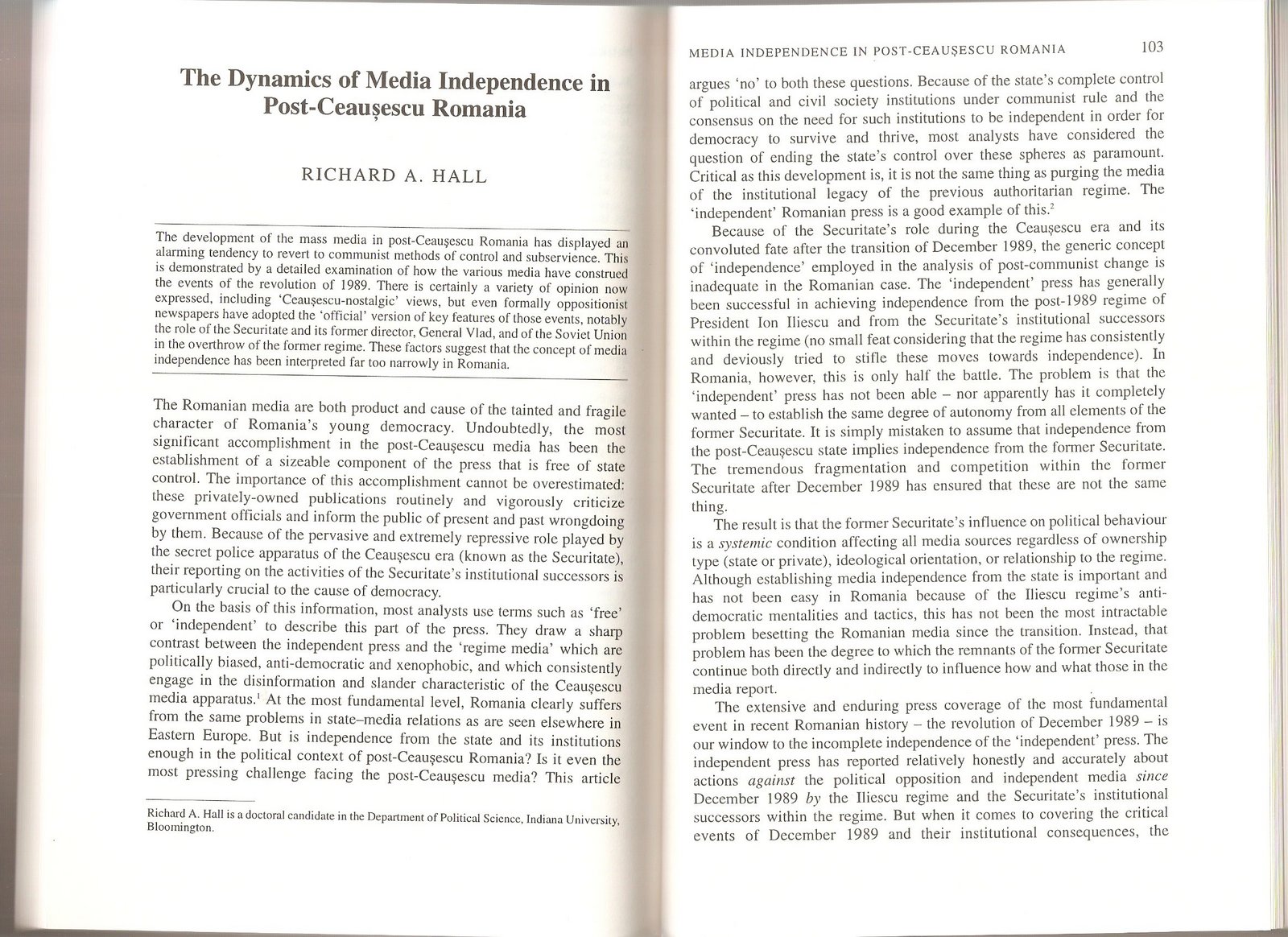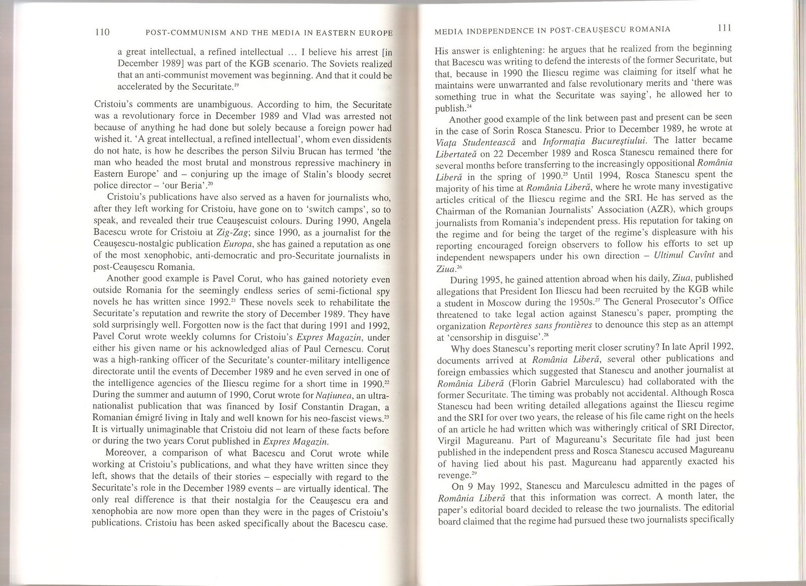 Related to my article “The Dynamics of Media Independence in Post-Ceausescu Romania,” I have previously discussed the case of Sorin Rosca Stanescu in print since that 1996 article…