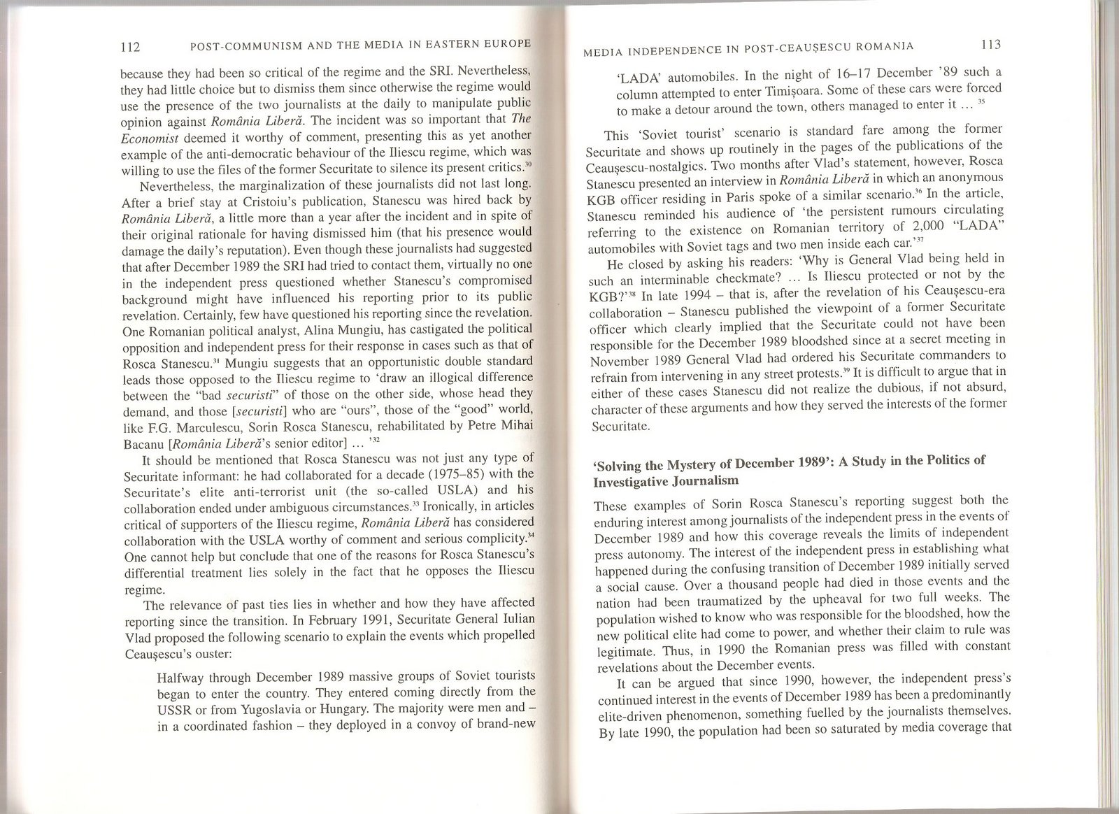 I recall in the mid-90s attempting to relate my doubts and misgivings about Stanescu’s reporting on December 1989 to Tismaneanu. He neither cared, nor took it seriously. In the tradition of academic putdowns, Gallagher actually accused me in a review of low standards of professionalism for questioning journalists of the independent press. Hence, why I was so thankful to come across Alina Mungiu-Pippidi’s 1995 observation–cited above–that crystallized and explained the double standard I had been witnessing (of course, at the time, I hadn’t realized that there was more of a back story to why Mungiu had Rosca Stanescu in her sights, but her analysis was still spot on and a breath of fresh air.)