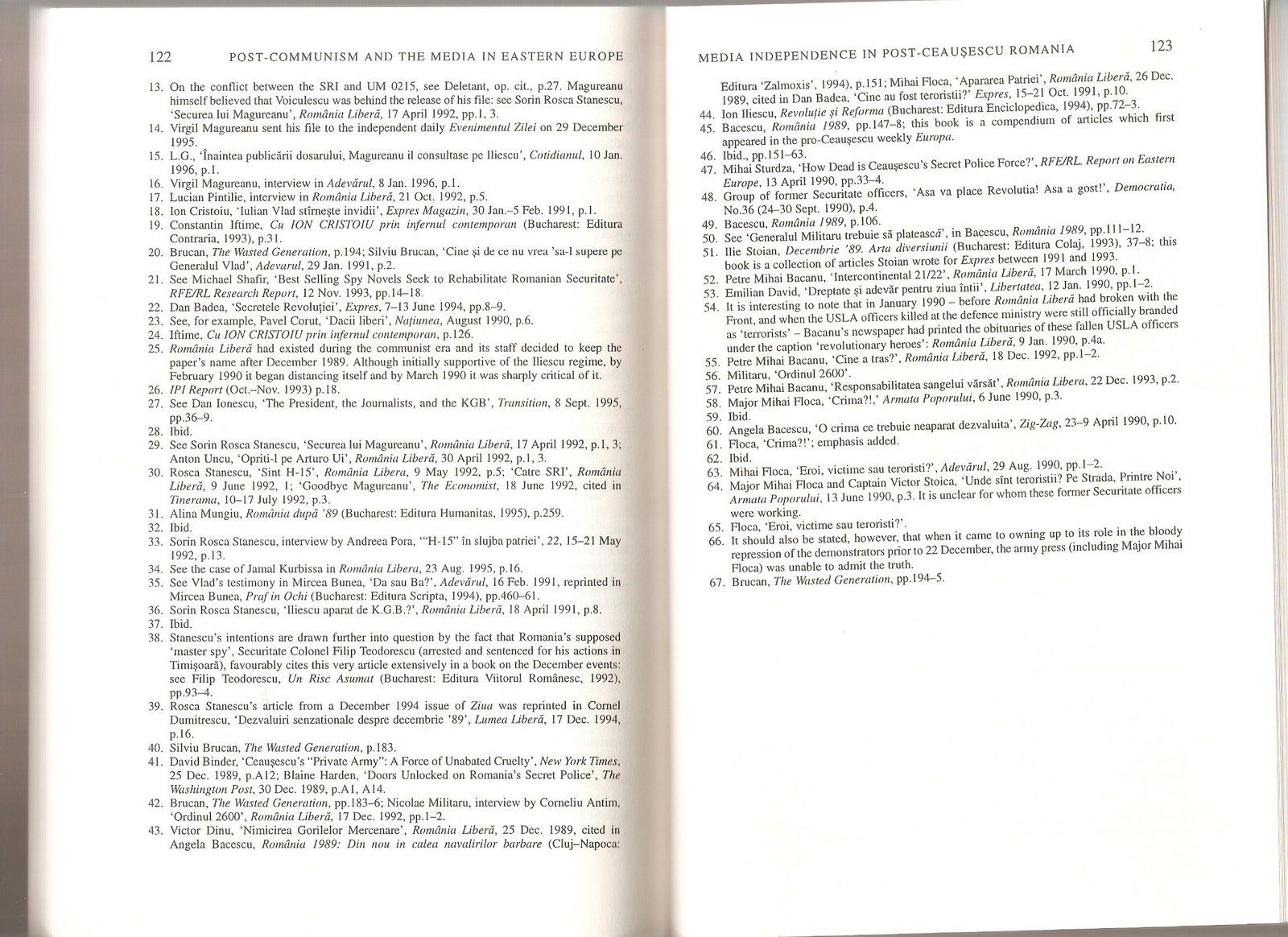 –One Romanian political analyst, Alina Mungiu, has castigated the political opposition and independent press for their response in cases such as that of Rosca Stanescu. Mungiu suggests that an opportunistic double standard leads those opposed to the Iliescu regime to “draw an illogical difference between the ‘bad securisti” of those on the other side, whose head they demand, and those [securisti] who are ‘ours’, those of the ‘good’ world, like F.G. Marculescu, Sorin Rosca Stanescu, rehabilitated by Petre Mihai Bacanu [Romania Libera’s senior editor]…” [Richard A. Hall, “The Dynamics of Media Independence in Post-Ceausescu Romania,” Special Issue: Post-Communism and the Media in Eastern Europe (ed. Patrick H. O’Neil), The Journal of Communist Studies and Transition Politics, Volume 12, no. 4 (December 1996)]