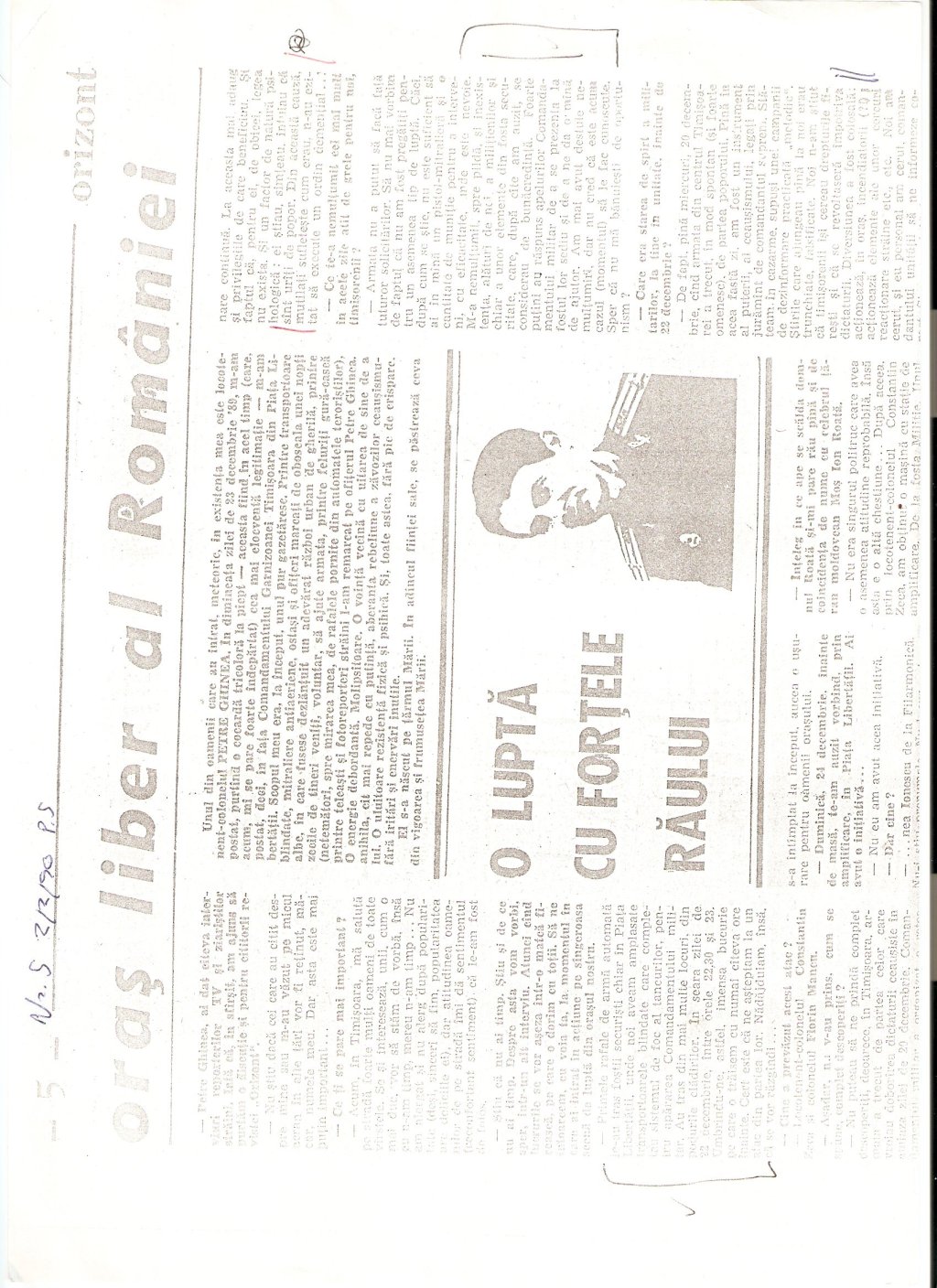 “O lupta cu fortele raului,” Orizont (Timisoara), nr. 5 (2 februarie 1990), p. 5.