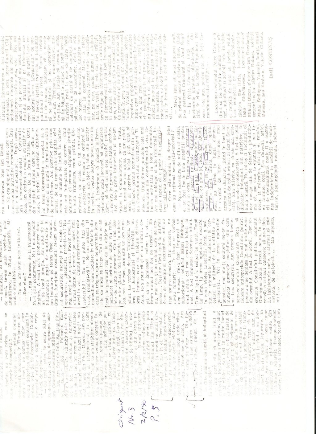 From this site http://www.banaterra.eu/romana/procesul-de-la-timisoara-1990-1991-vol-v ]. The following are from Volume V. Alexandru Koos’ courtroom testimony during the so-called Timisoara trial (date of his testimony appears to be 3 October 1990). Koos discusses all of the above incidents in detail, and also the specifics of those detained during these days.