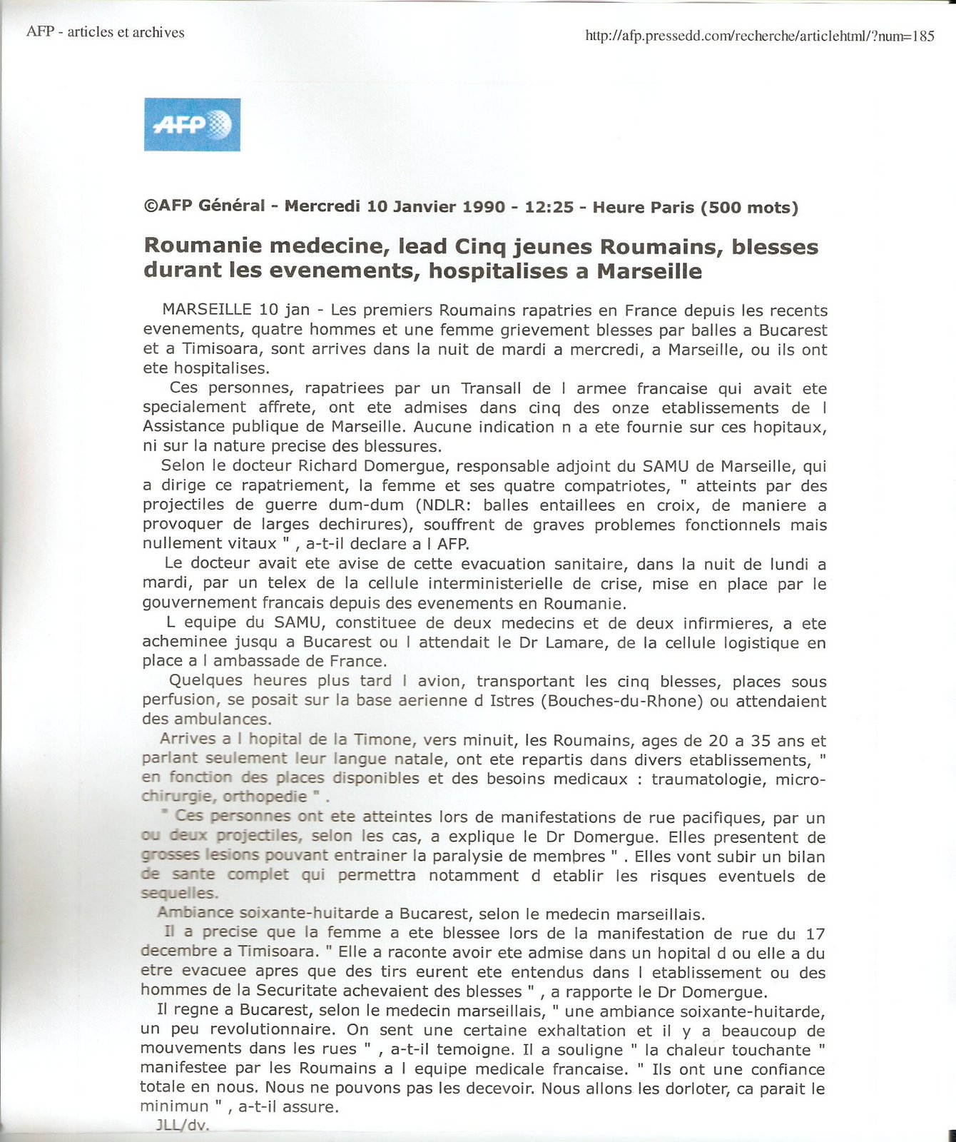 Il a precise que la femme a ete blessee lors de la manifestation de rue du 17 decembre a Timisoara. ” Elle a raconte avoir ete admise dans un hopital d ou elle a du etre evacuee apres que des tirs eurent ete entendus dans l etablissement ou des hommes de la Securitate achevaient des blesses ” , a rapporte le Dr Domergue.