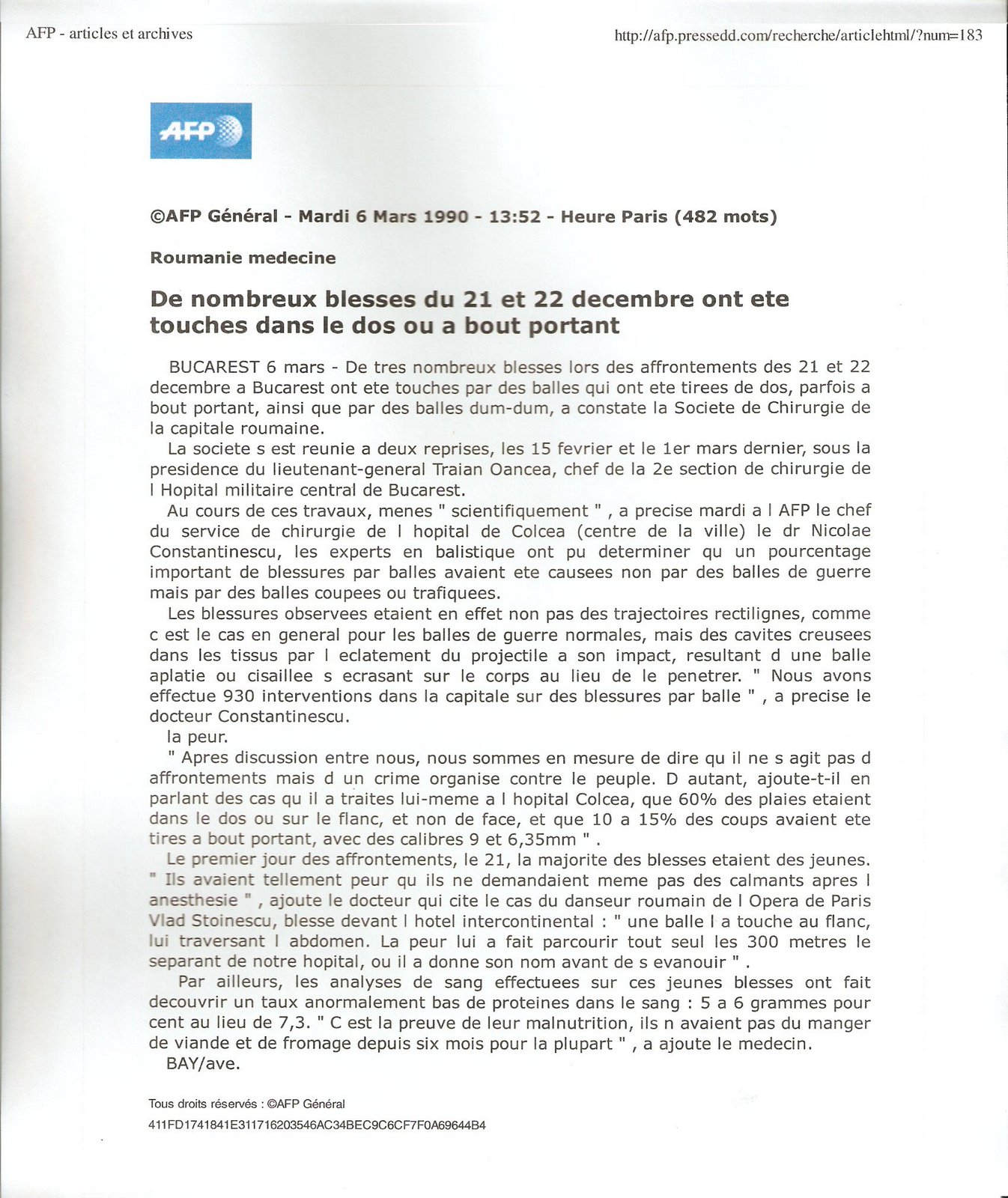 At the heart of their “scientifically”-conducted work, the chief surgeon of the Coltea Hospital (in the center of the city) Dr. Nicolae Constantinescu declared to AFP on Tuesday [6 March 1990], ballistic experts could determine that a significant percentage of those injured by bullets were caused not by normal [wartime] munitions but by bullets that had been cut or imported. [for additional information from Dr. Nicolae “Nae” Constantinescu see here http://atomic-temporary-3899751.wpcomstaging.com/2014/05/18/surgeons-from-bucharests-main-hospitals-discuss-their-experiences-in-december-1989-lt-gnl-traian-oancea-dr-nicolae-nae-constantinescu-dr-dan-gavriliu-dr-nicolae-angelescu/]
