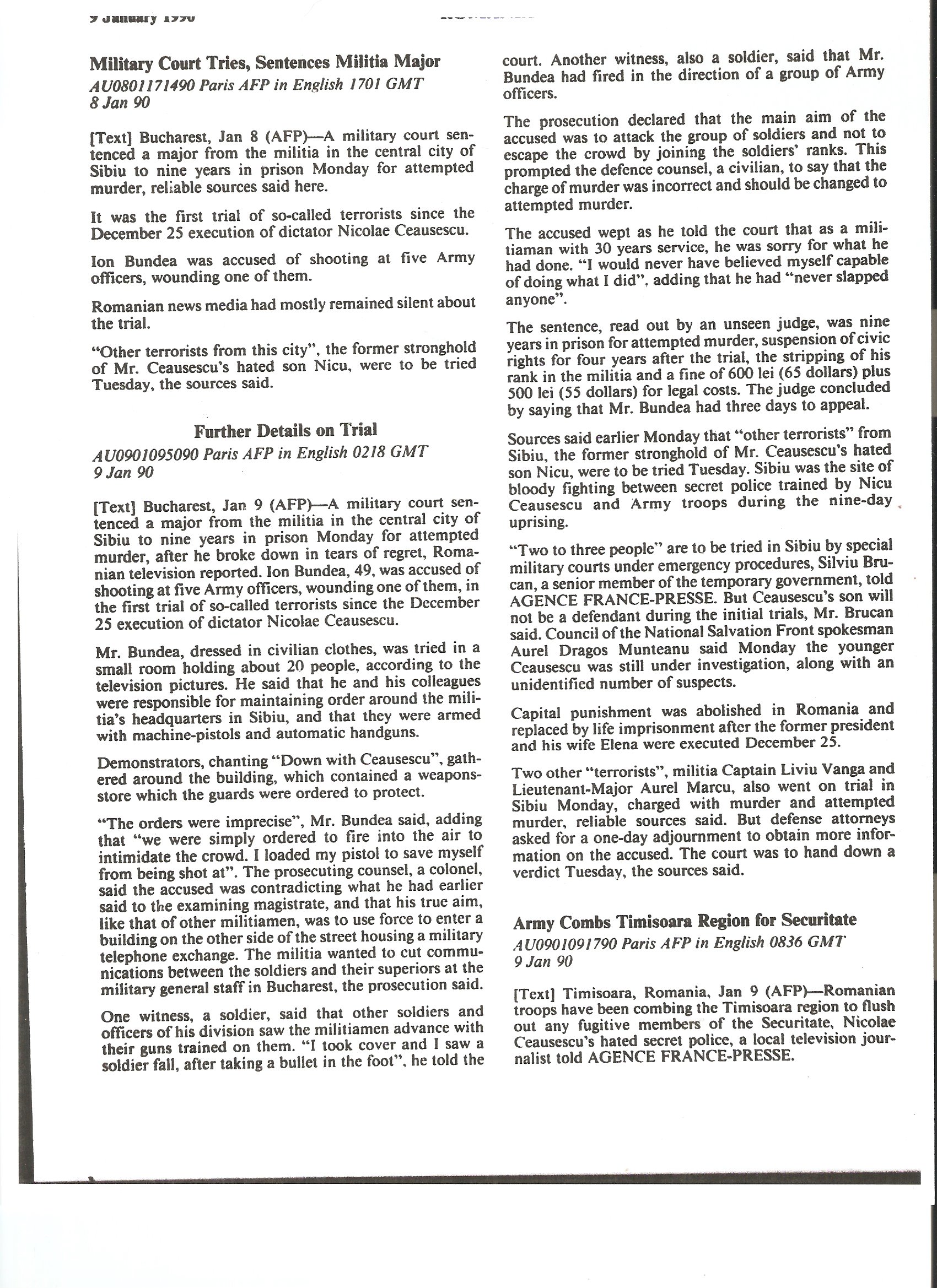 FBIS-EEU-90-006 9 January 1990 “Army Combs Timisoara Region for Securitate” Agence France Presse 9 January 1990, pp. 61-62