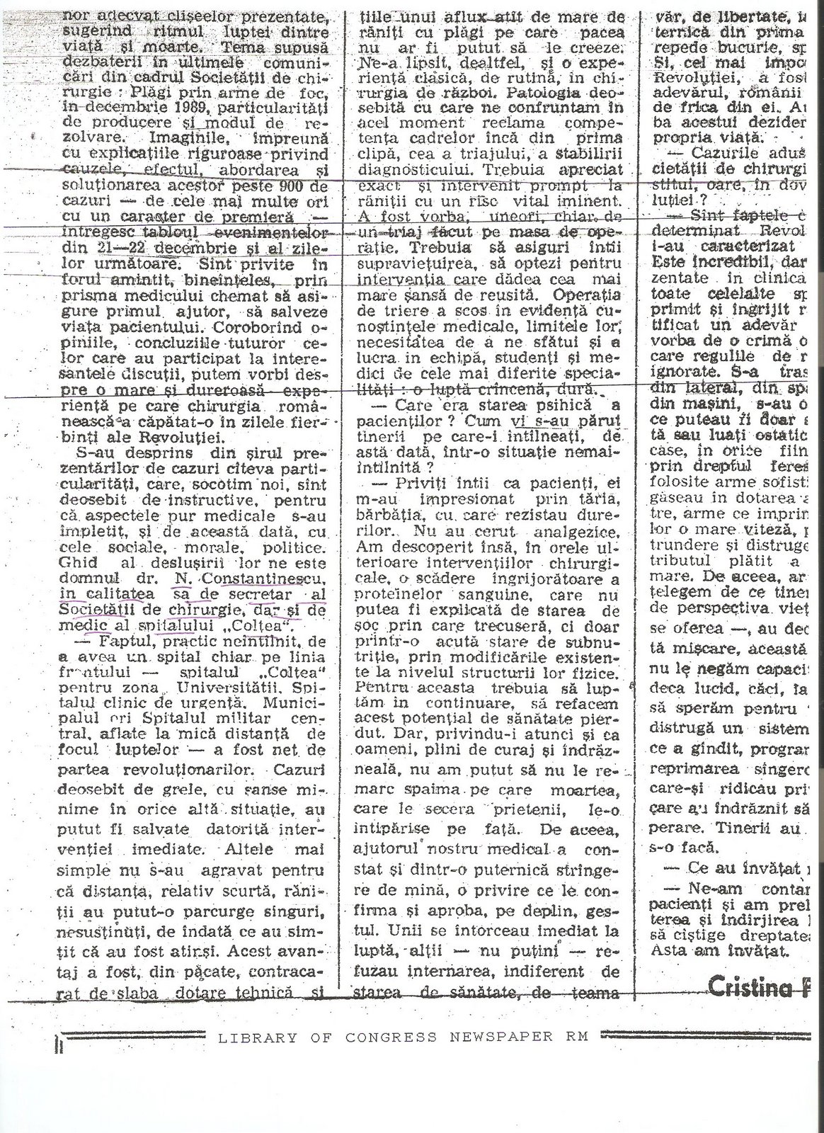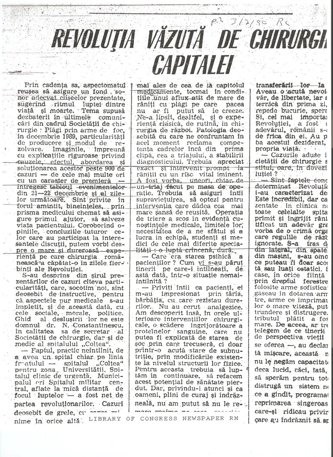 By contrast, the Society of Surgeons’ meeting received limited coverage in Romania, and somehow when it did, as in the Romania Libera article below the details and significance of the existence and use of atypical munitions such as DUM-DUM bullets was lost upon the Romanian journalist attending the event. (Cristina Popescu, “Revolutia Vazuta de Chirurgii Capitalei,” Romania Libera, 7 martie 1990, p. 2) The other two major dailies of the time–Tineretul Liber and Libertatea–did not report on the press conference.