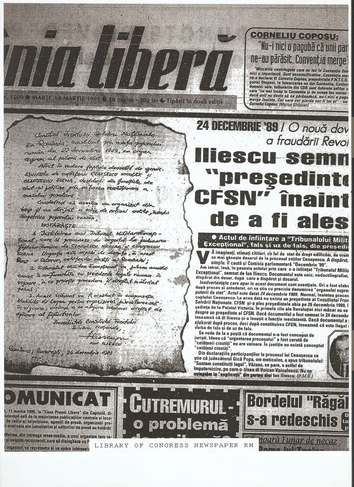 We’ll start with a copy printed from a microfiche machine in late 1990/early 1991 at Indiana University (Bloomington)’s Main Library. It contains an excerpt long since forgotten, especially among those who deny the idea of Securitate terrorists and mercenaries loyal to Nicolae Ceausescu who fought on after 22 December 1989. Below it, in Romanian, what Adrian Paunescu’s Totusi Iubirea in May 1991- June 1992 under the title “Adevarata stenograma a procesului Nicolae Ceausescu – Elena Ceausescu” (xeroxed spring 1997 Babes-Bolyai University Library, Cluj, Romania)