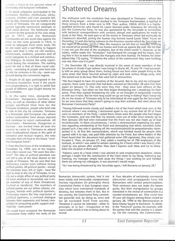 Long-lost from my graduate school (early-mid 1990s), Ph.D. dissertation archives, from the East European Reporter, 1990, p. 33. It is unclear, exactly which issue, perhaps spring/summer or fall 1990, but it is clearly 1990. The story of Virgil Iatica who wrote a letter to EER, parts of which they published as “Shattered Dreams.” Iatica left in disgust “As I was being threatened by the Securitate again, I left Romania on January 28 [1990]”…