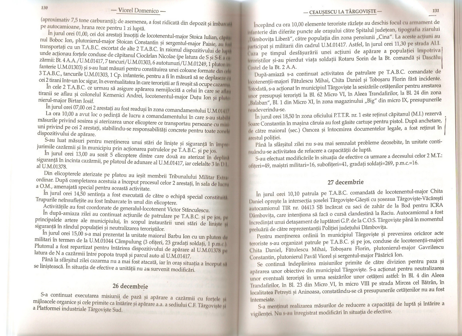 It is important to reconstruct what was transpiring in Targoviste itself during December 1989 and what people who were on the ground–and not those flown in from Bucharest, i.e. the likes of Stanculescu, Voican Voiculescu, Magureanu, and yes, Dan Voinea–say about what they experienced. To her credit, Ruxandra Cesereanu (http://anatolicoblogg.blogspot.com/2014/12/cesereanu-ruxandra-ceausescus-trial-and.html) touches upon the works of Viorel Domenico, such as Ceausescu la Targoviste: 22-25 decembrie 1989, but she missed or chooses not to draw attention to some important details that come out of that 1999 volume.